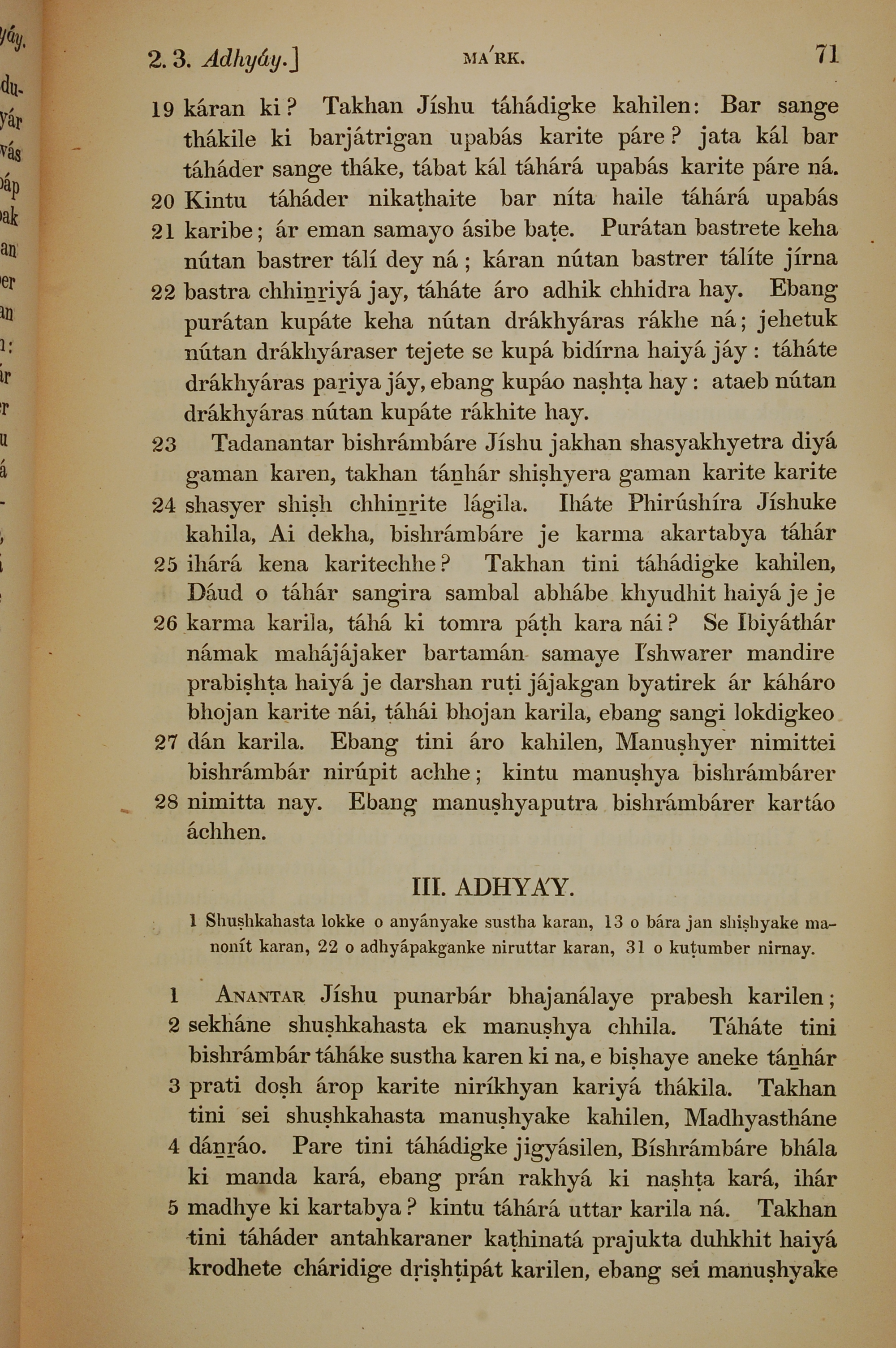 1839年孟加拉語新約全書 馬可福音 2 章 19 節到 3 章 5 節