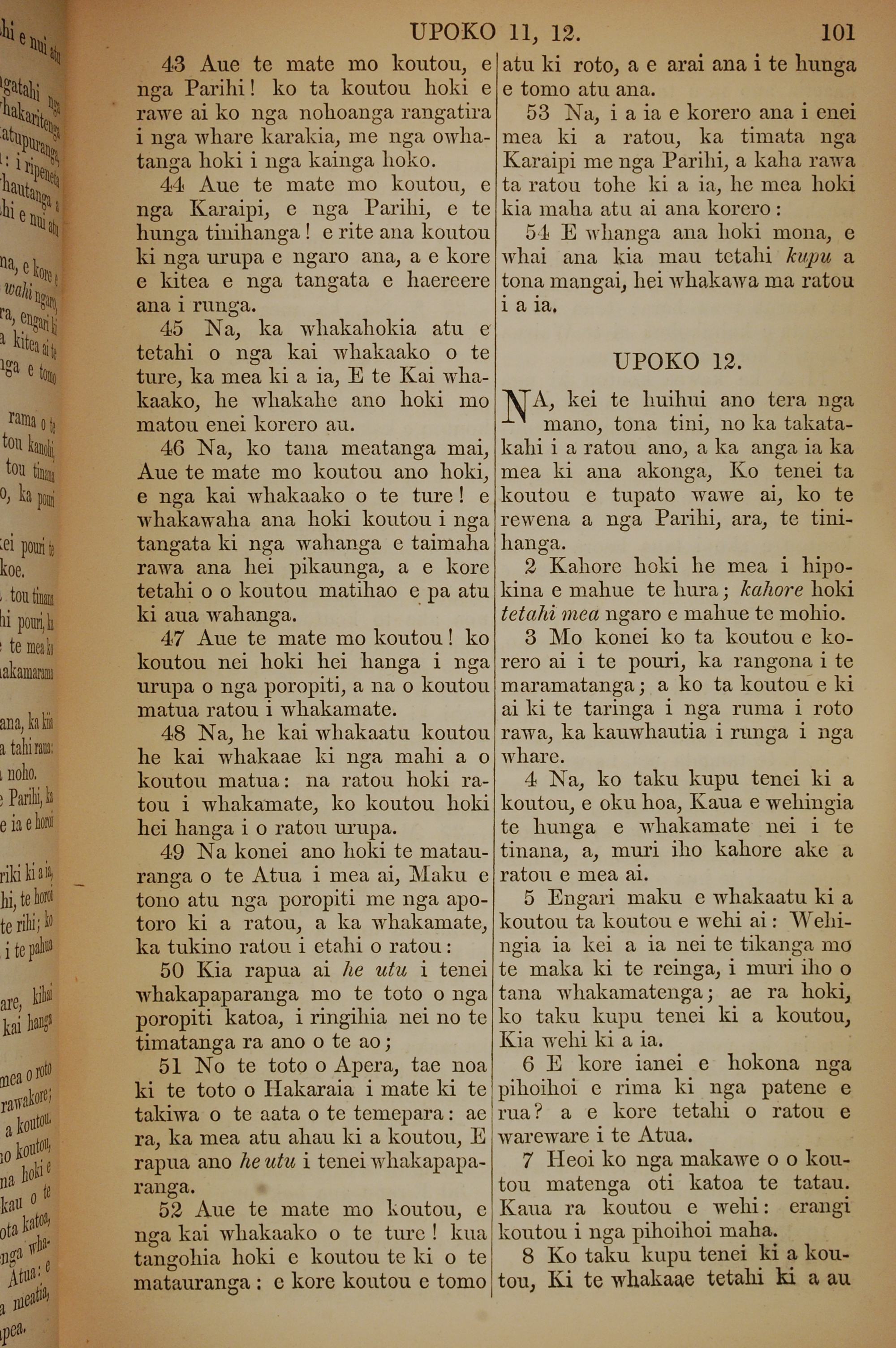 1852年KO TE KAWENATA HOU O TO TATOU ARIKI O TE KAI WHAKAORA O IHU KARAITI 路加福音 11 章 43 節到 12 章 8 節