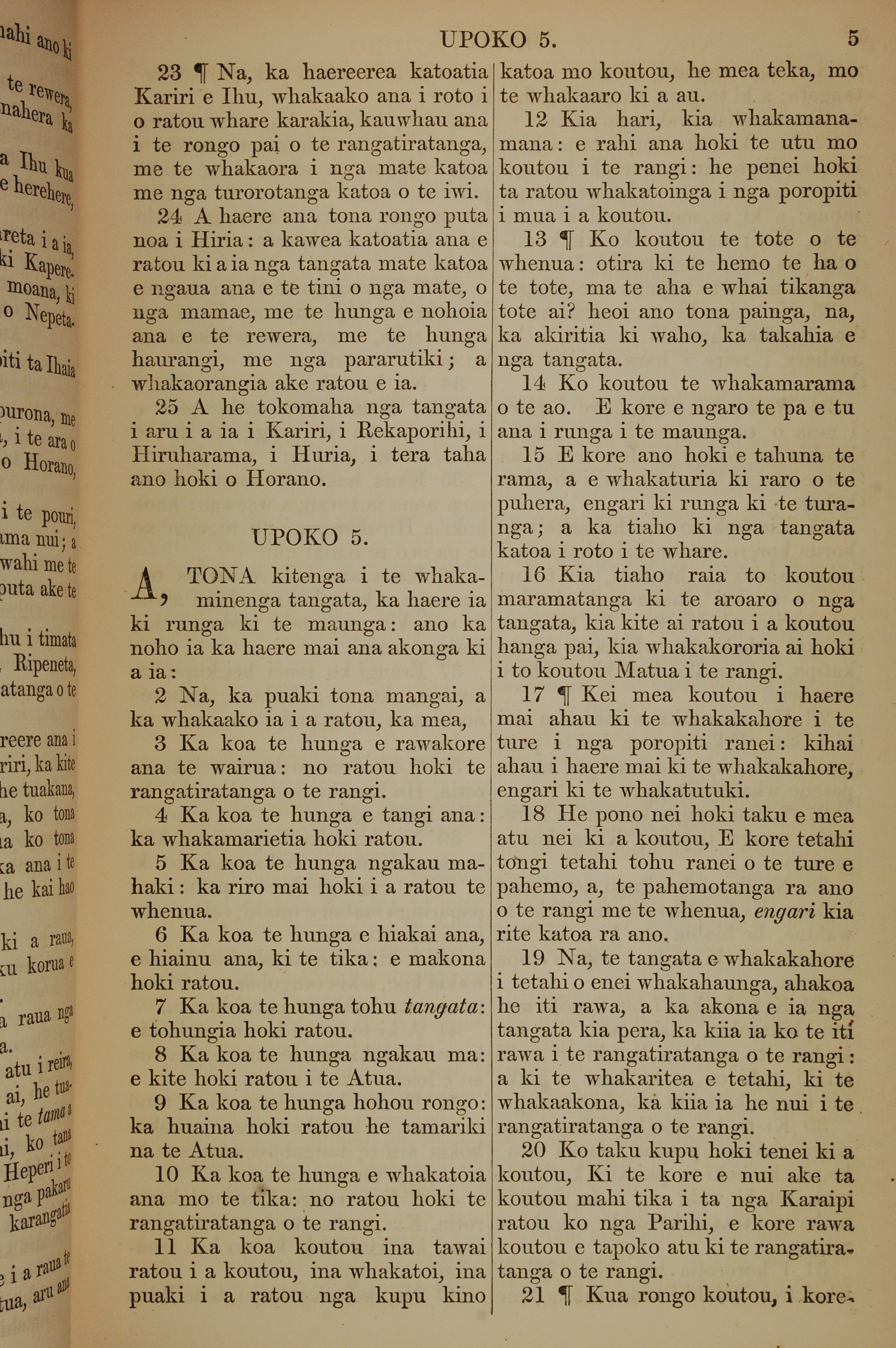 1852年KO TE KAWENATA HOU O TO TATOU ARIKI O TE KAI WHAKAORA O IHU KARAITI 馬太福音 4 章 23 節到 5 章 21 節
