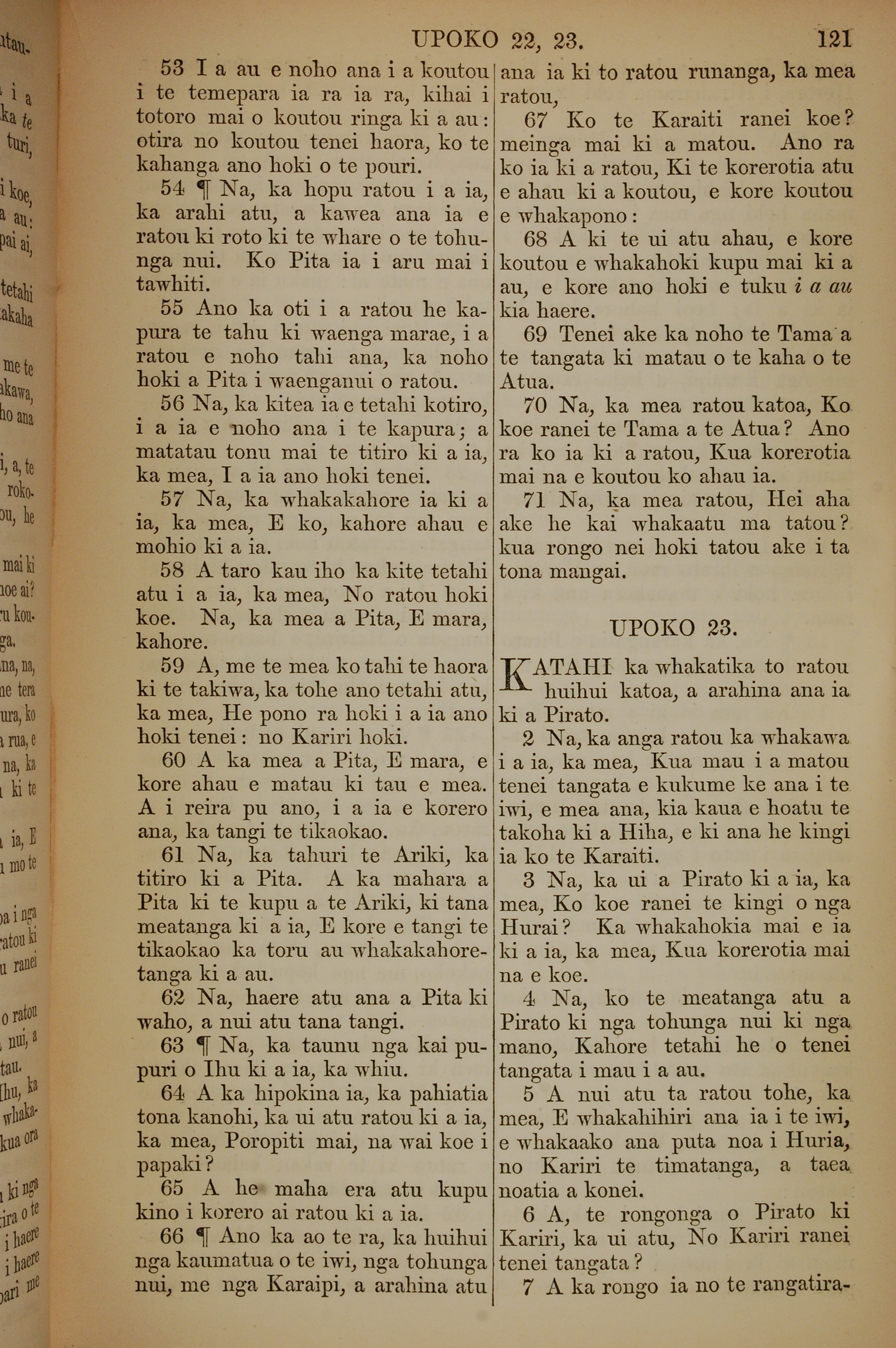 1852年KO TE KAWENATA HOU O TO TATOU ARIKI O TE KAI WHAKAORA O IHU KARAITI 路加福音 22 章 53 節到 23 章 7 節