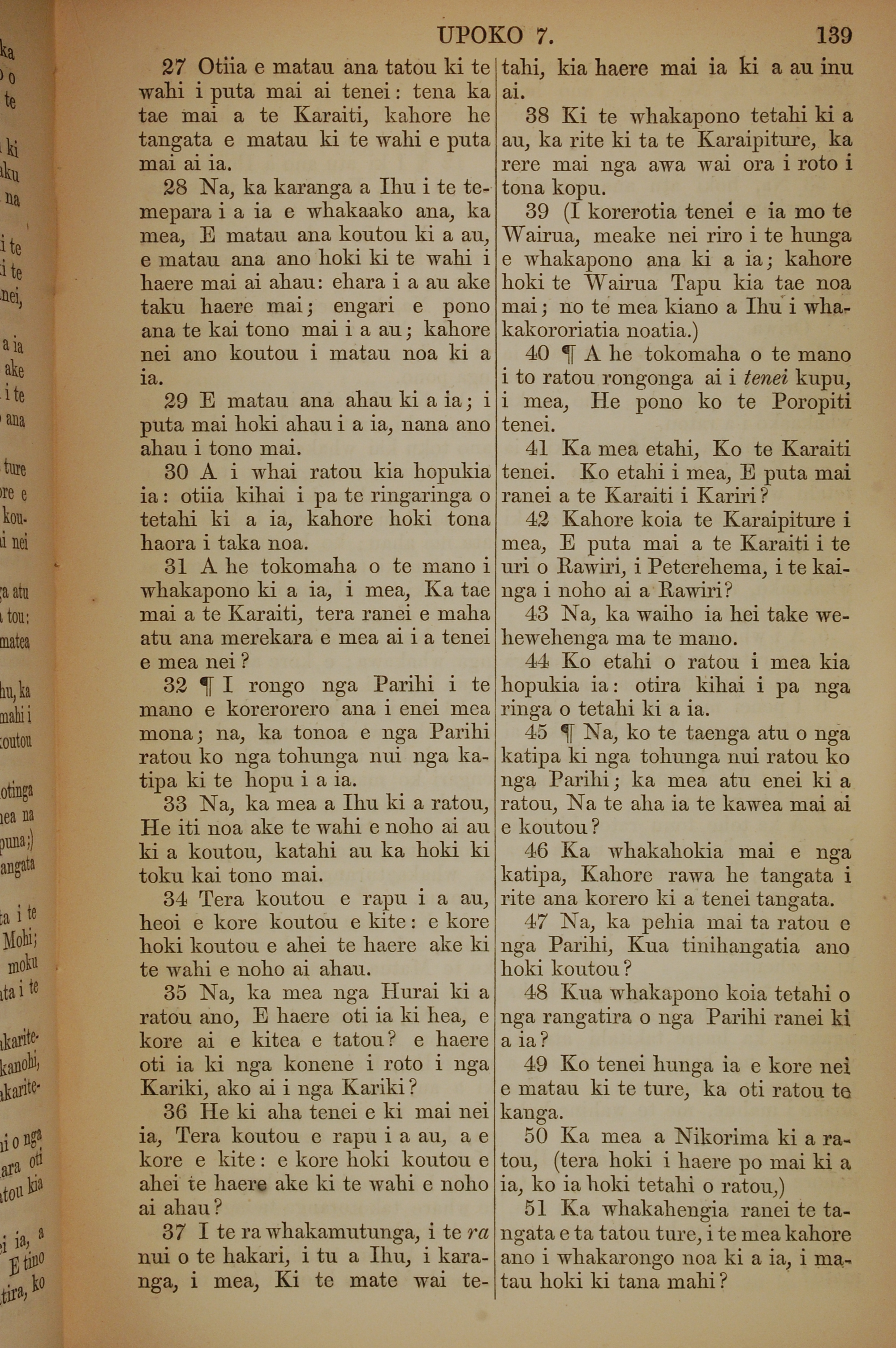 1852年KO TE KAWENATA HOU O TO TATOU ARIKI O TE KAI WHAKAORA O IHU KARAITI 約翰福音 7 章 27 節到 7 章 51 節