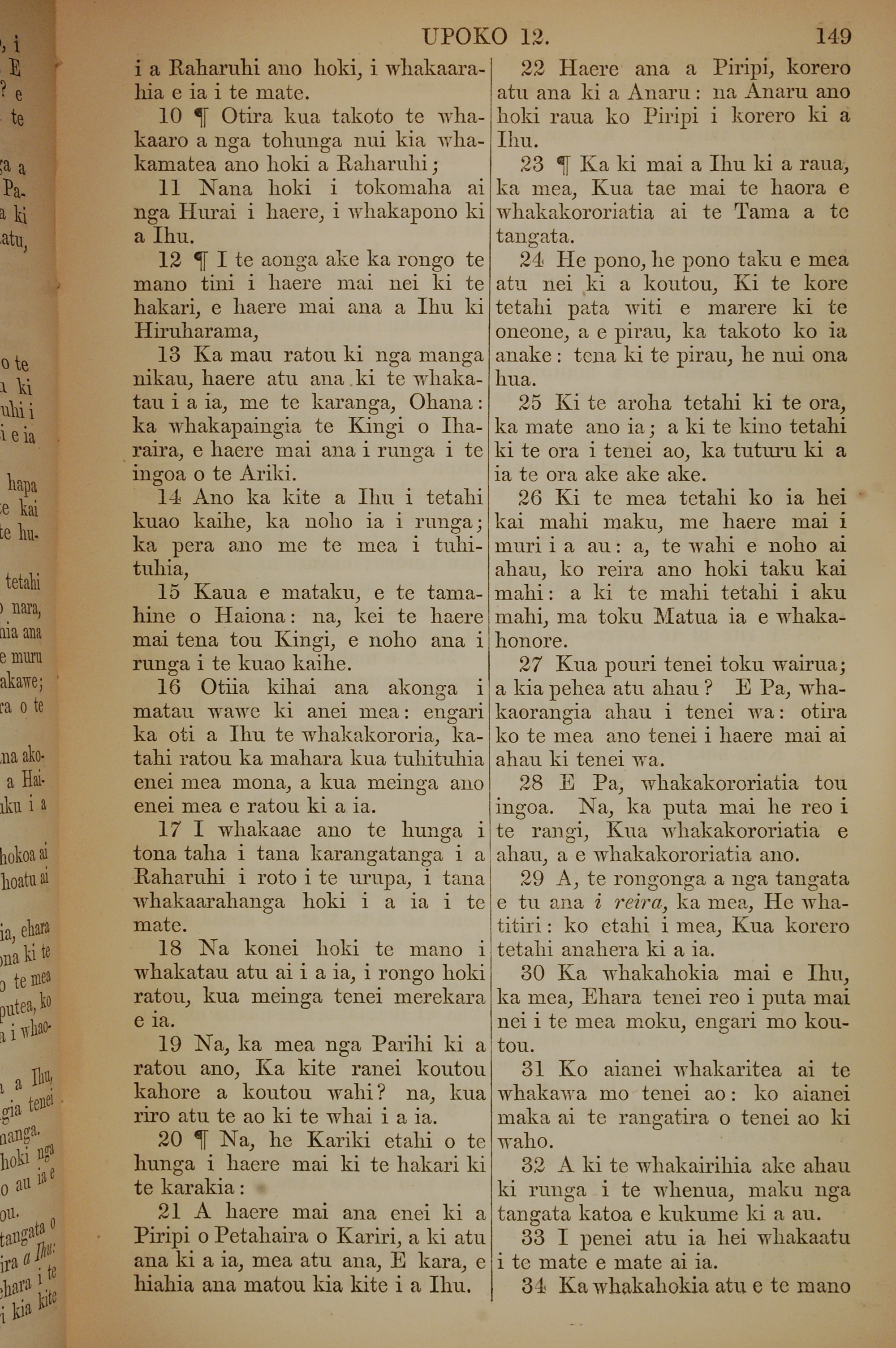 1852年KO TE KAWENATA HOU O TO TATOU ARIKI O TE KAI WHAKAORA O IHU KARAITI 約翰福音 12 章 10 節到 12 章 34 節