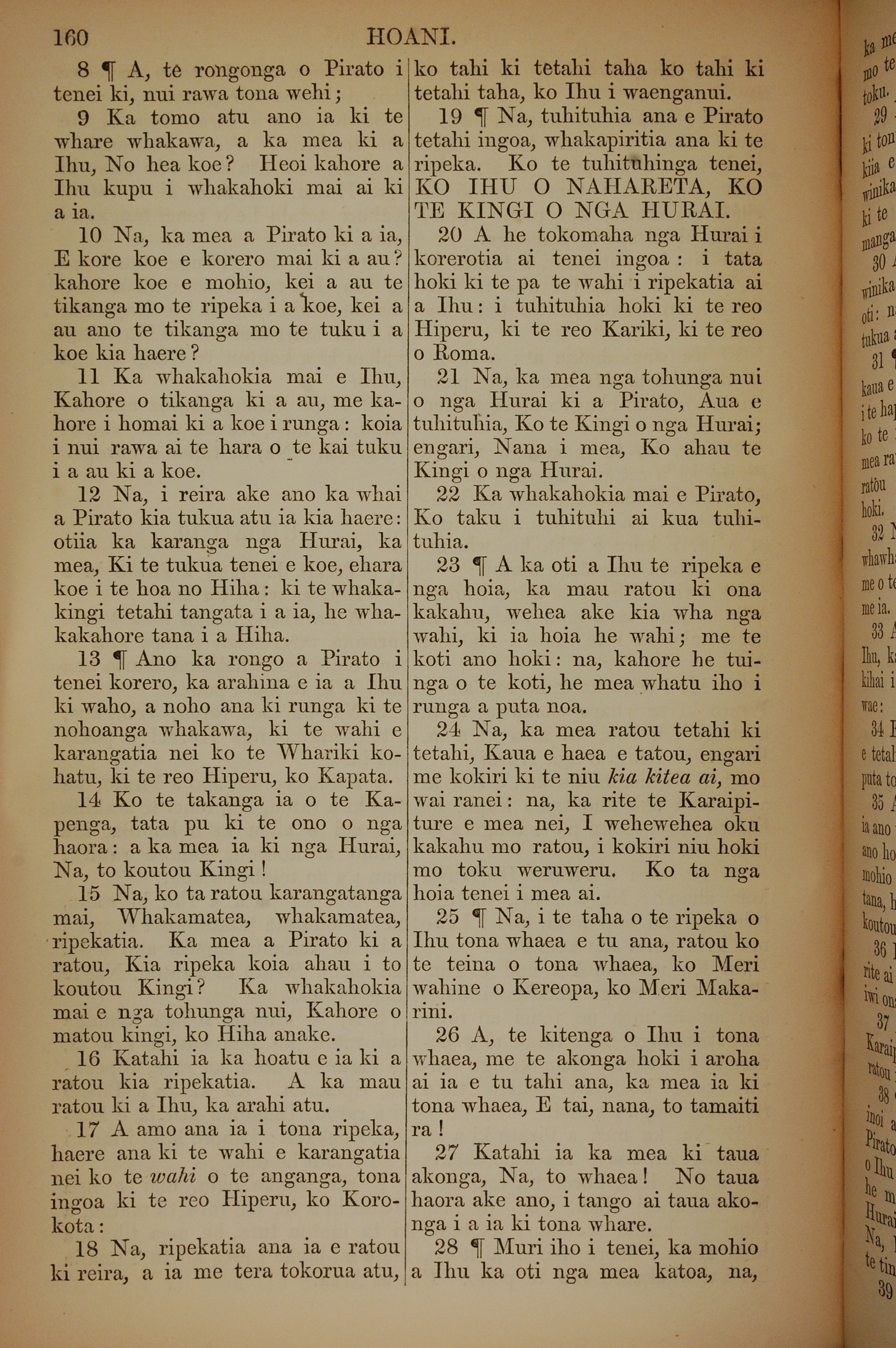 1852年KO TE KAWENATA HOU O TO TATOU ARIKI O TE KAI WHAKAORA O IHU KARAITI 約翰福音 19 章 8 節到 19 章 28 節