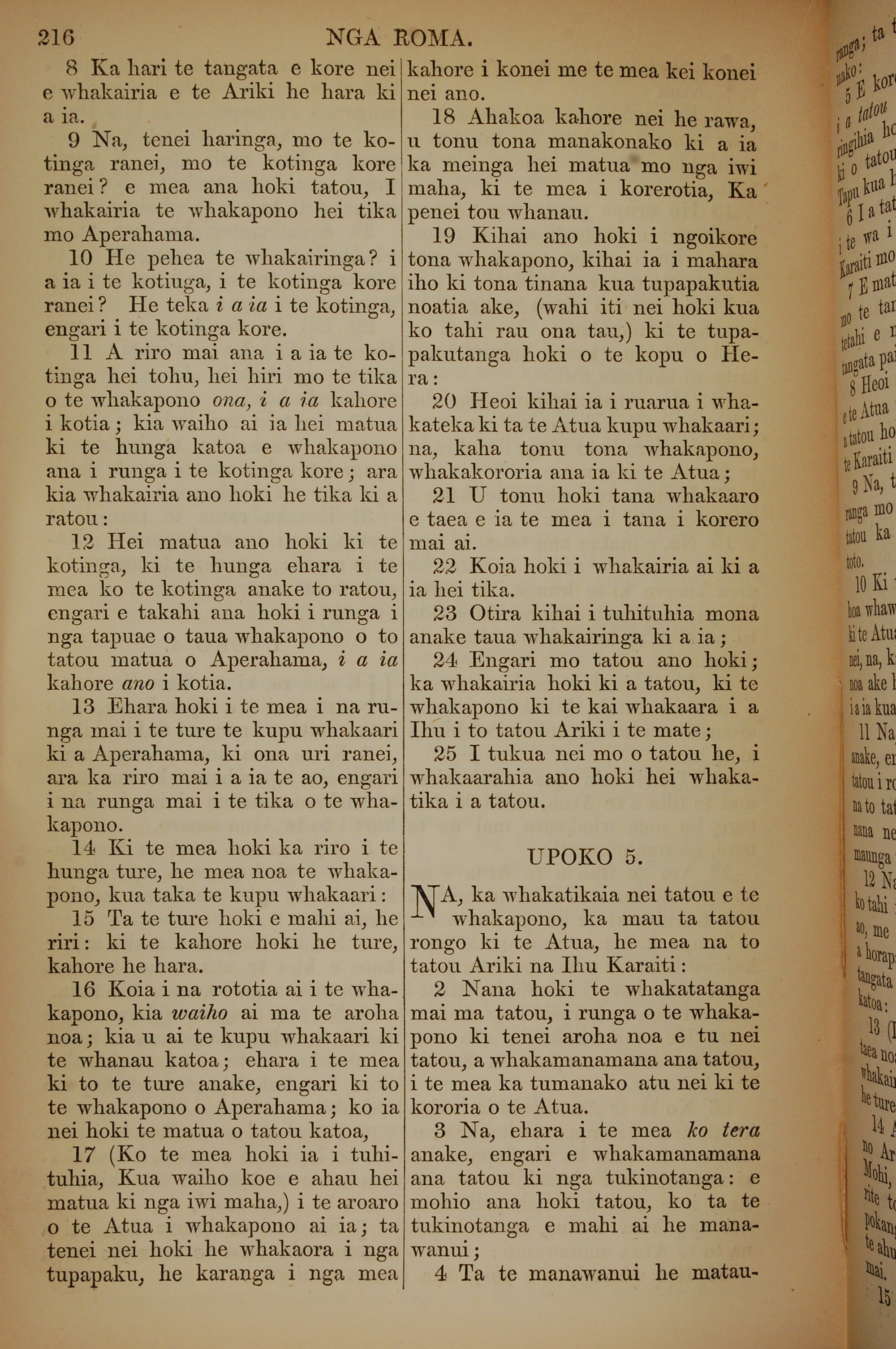 1852年KO TE KAWENATA HOU O TO TATOU ARIKI O TE KAI WHAKAORA O IHU KARAITI 羅馬書 4 章 8 節到 5 章 4 節