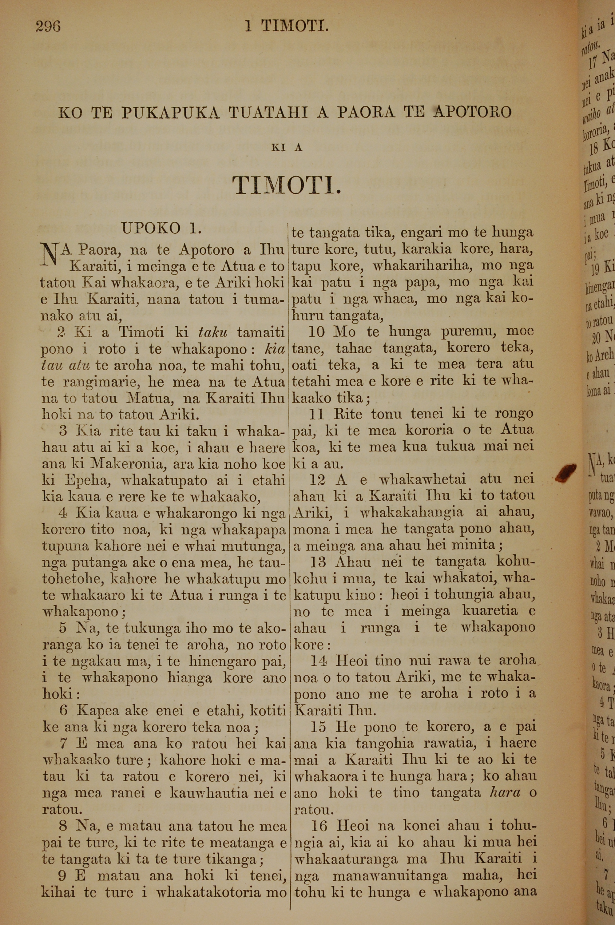 1852年KO TE KAWENATA HOU O TO TATOU ARIKI O TE KAI WHAKAORA O IHU KARAITI 提摩太前書 1 章 1 節到 1 章 16 節