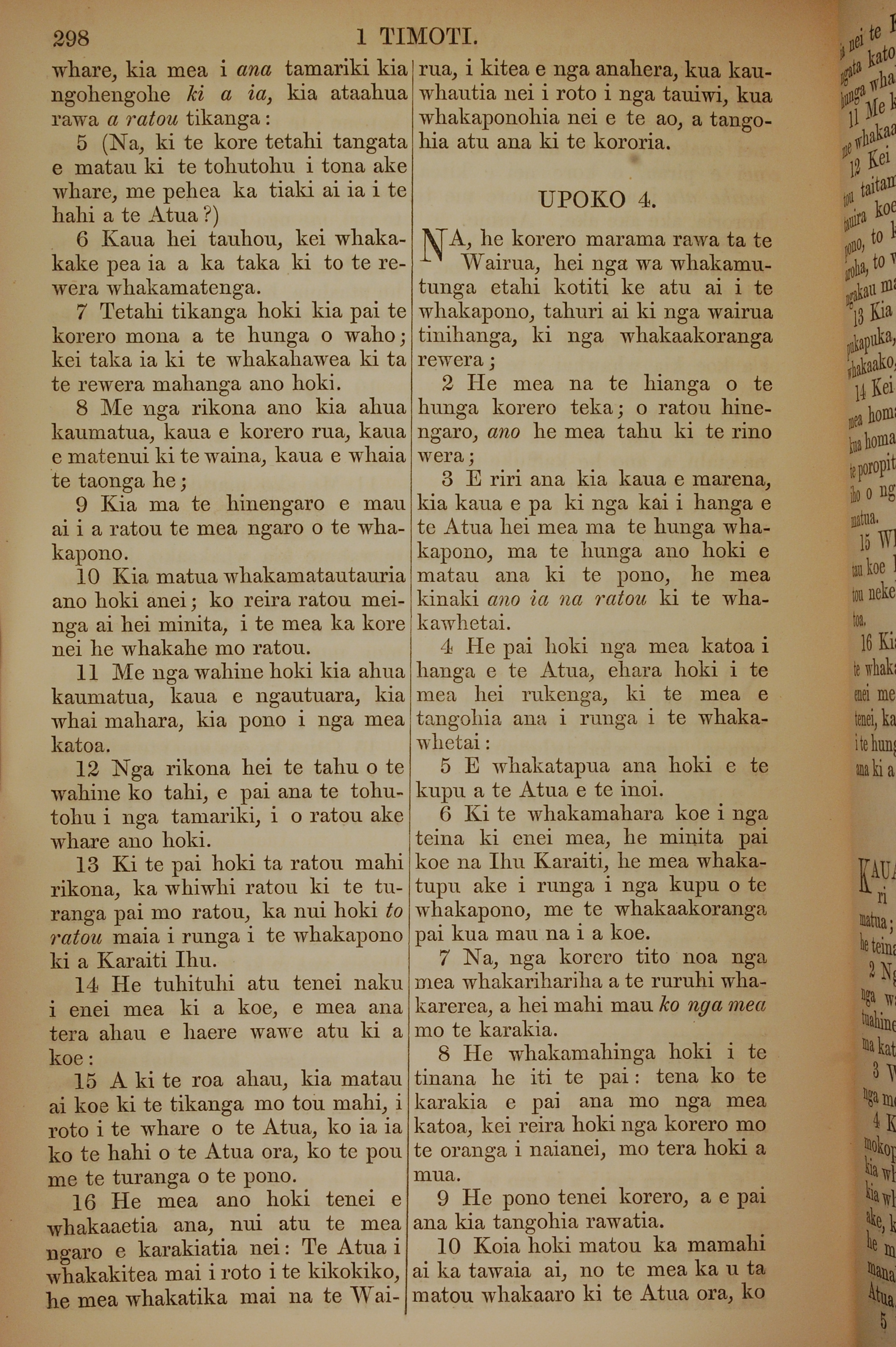 1852年KO TE KAWENATA HOU O TO TATOU ARIKI O TE KAI WHAKAORA O IHU KARAITI 提摩太前書 3 章 5 節到 4 章 10 節