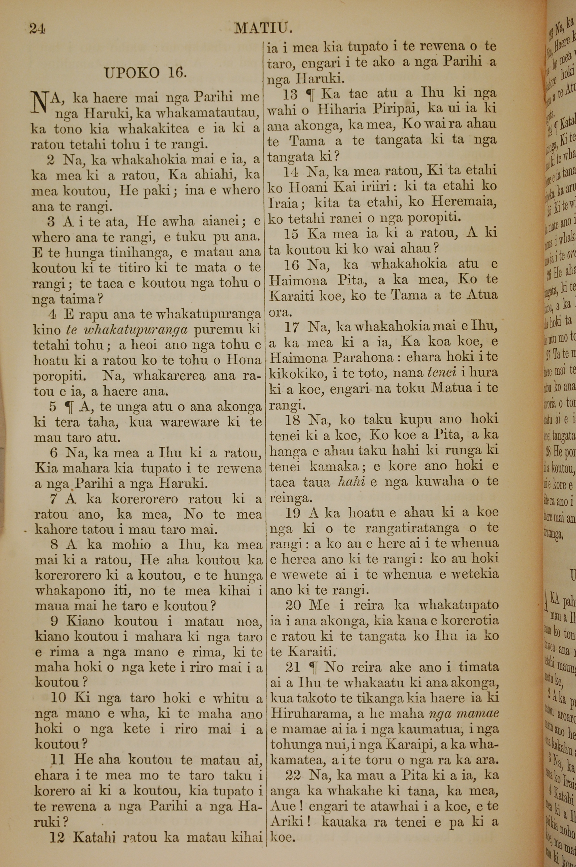1852年KO TE KAWENATA HOU O TO TATOU ARIKI O TE KAI WHAKAORA O IHU KARAITI 馬太福音 16 章 1 節到 16 章 22 節