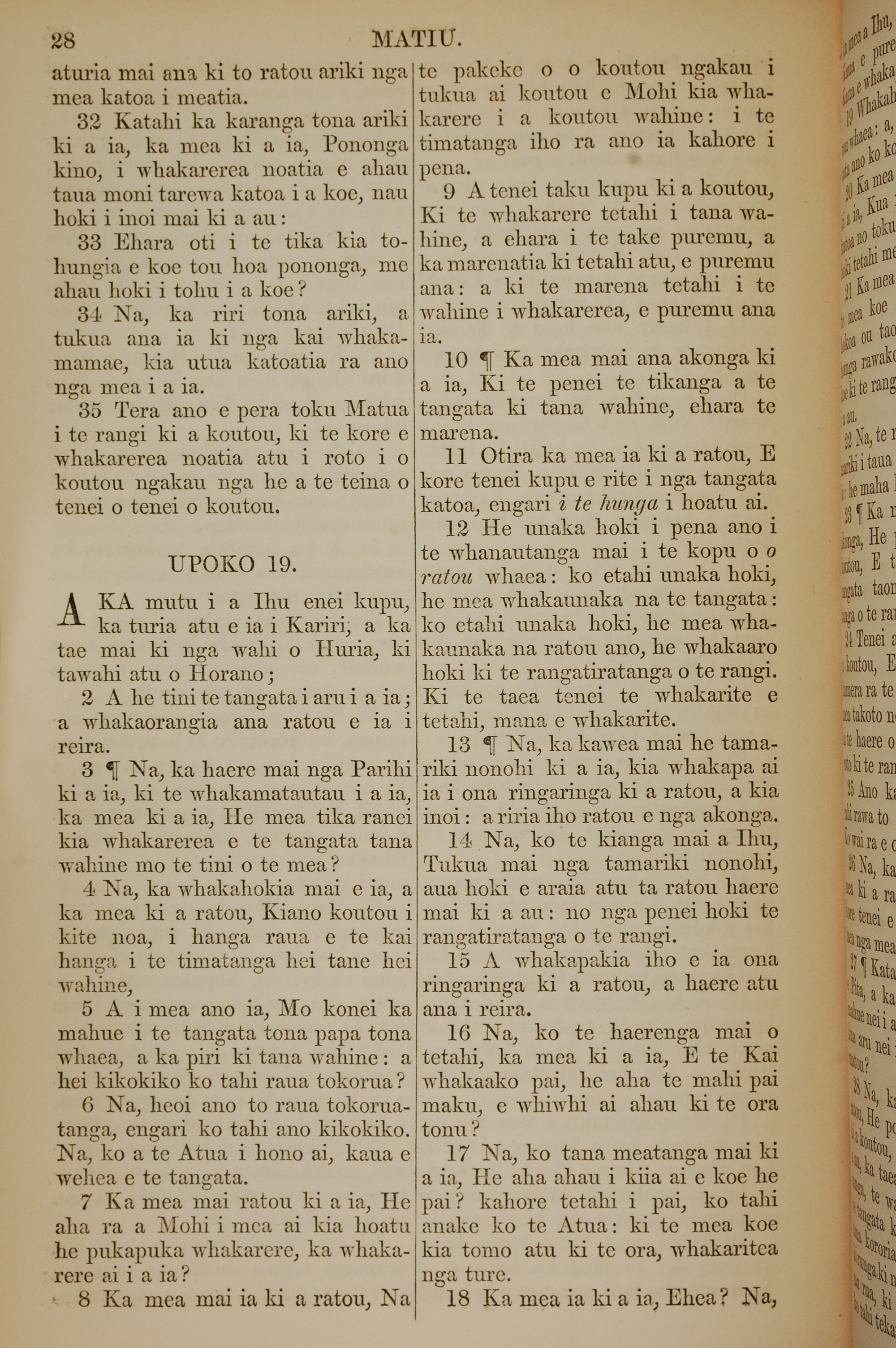 1852年KO TE KAWENATA HOU O TO TATOU ARIKI O TE KAI WHAKAORA O IHU KARAITI 馬太福音 18 章 32 節到 19 章 18 節