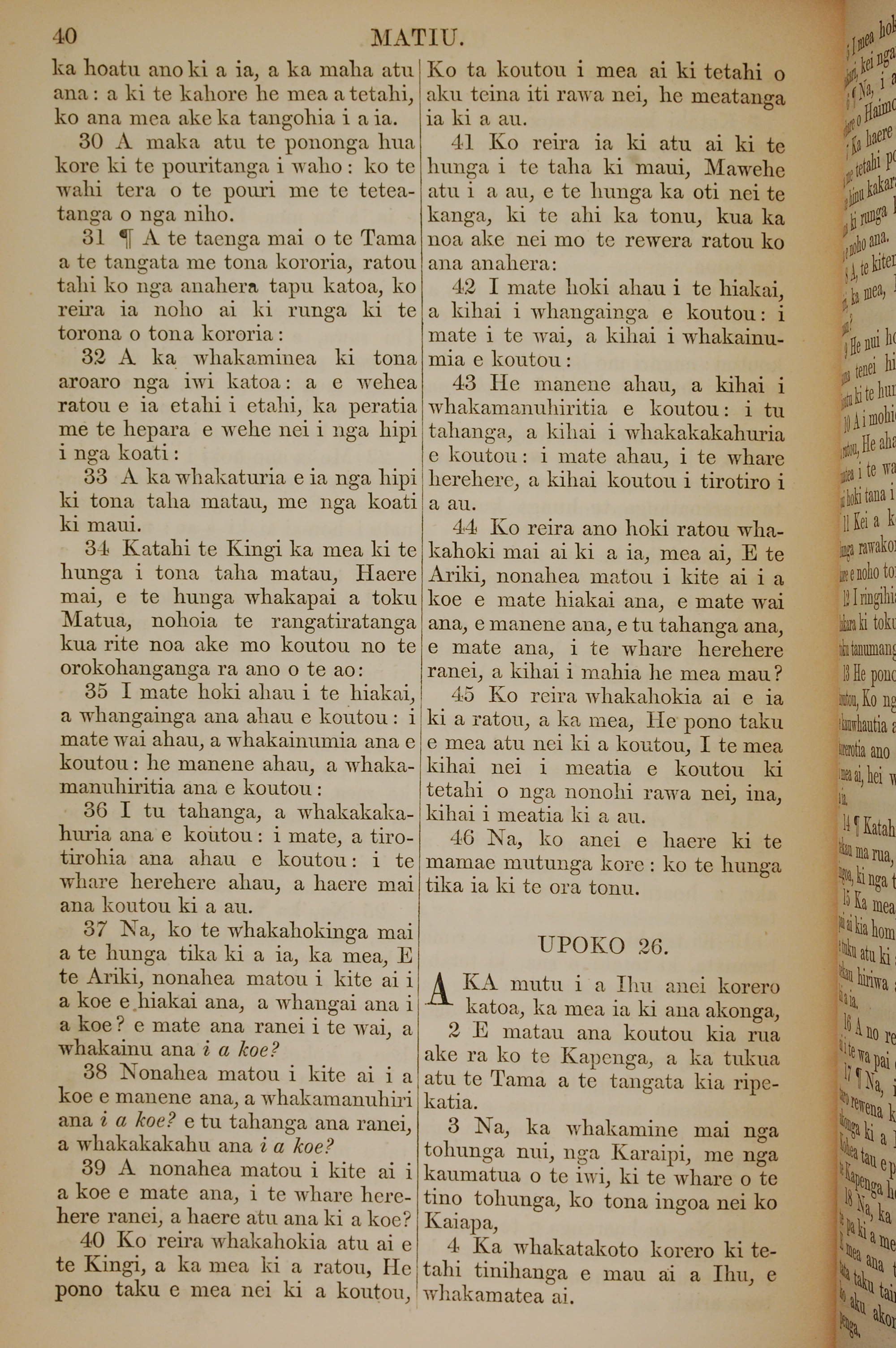 1852年KO TE KAWENATA HOU O TO TATOU ARIKI O TE KAI WHAKAORA O IHU KARAITI 馬太福音 25 章 30 節到 26 章 4 節