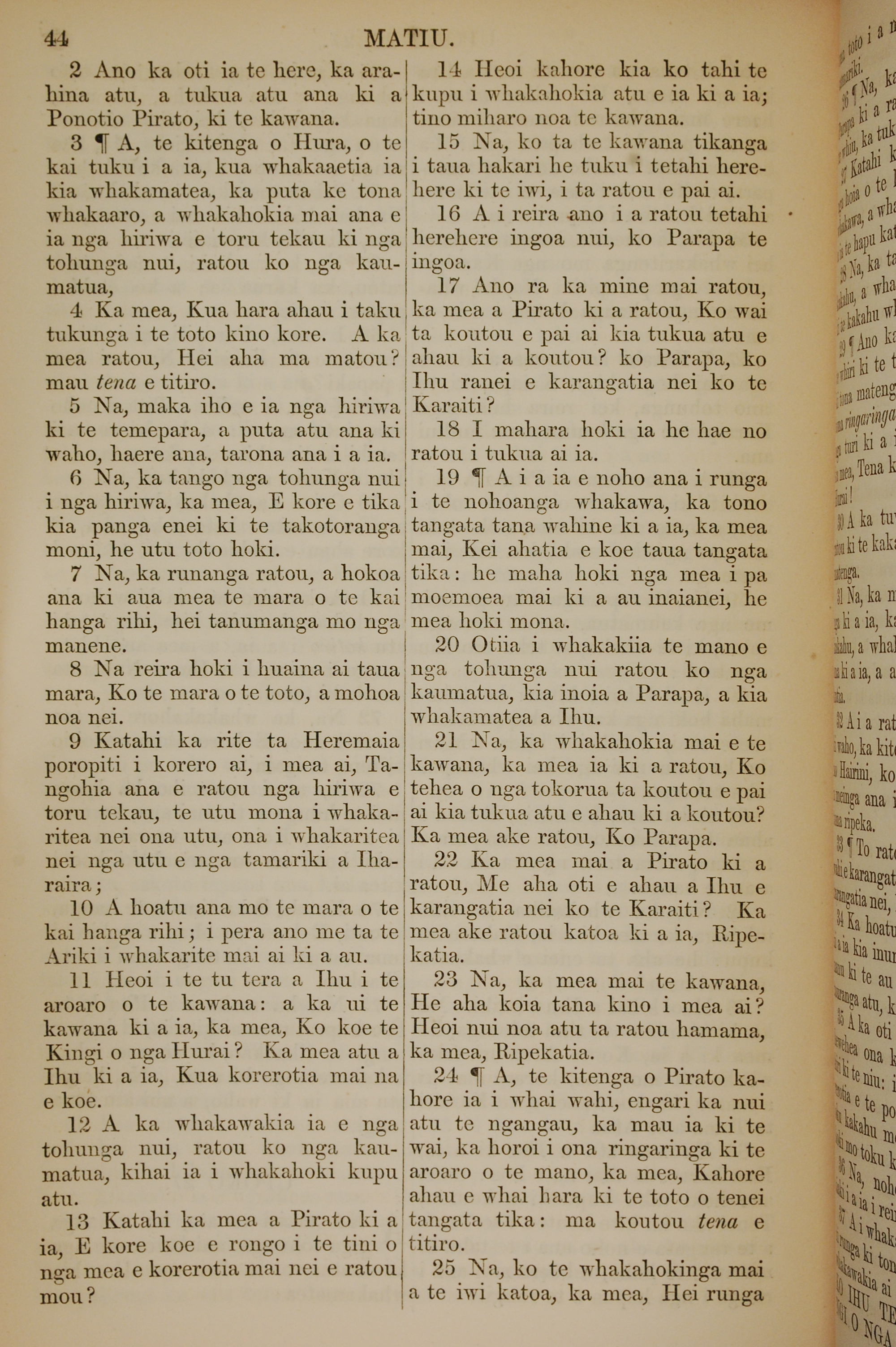 1852年KO TE KAWENATA HOU O TO TATOU ARIKI O TE KAI WHAKAORA O IHU KARAITI 馬太福音 27 章 2 節到 27 章 25 節