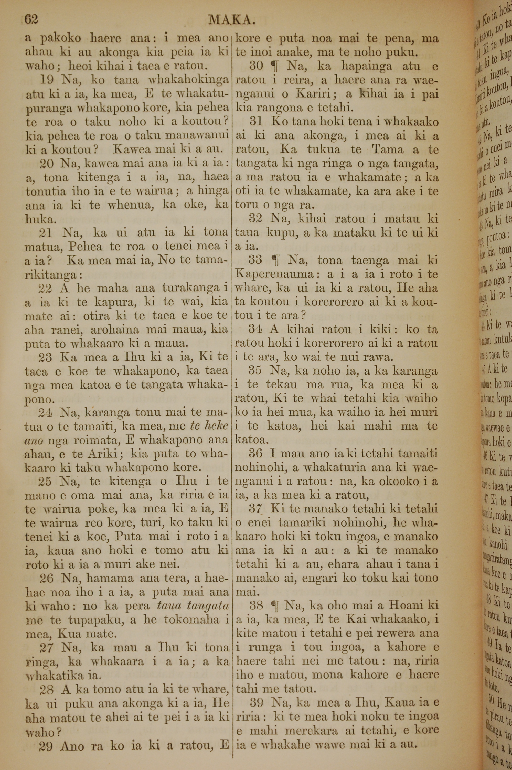 1852年KO TE KAWENATA HOU O TO TATOU ARIKI O TE KAI WHAKAORA O IHU KARAITI 馬可福音 9 章 19 節到 9 章 39 節