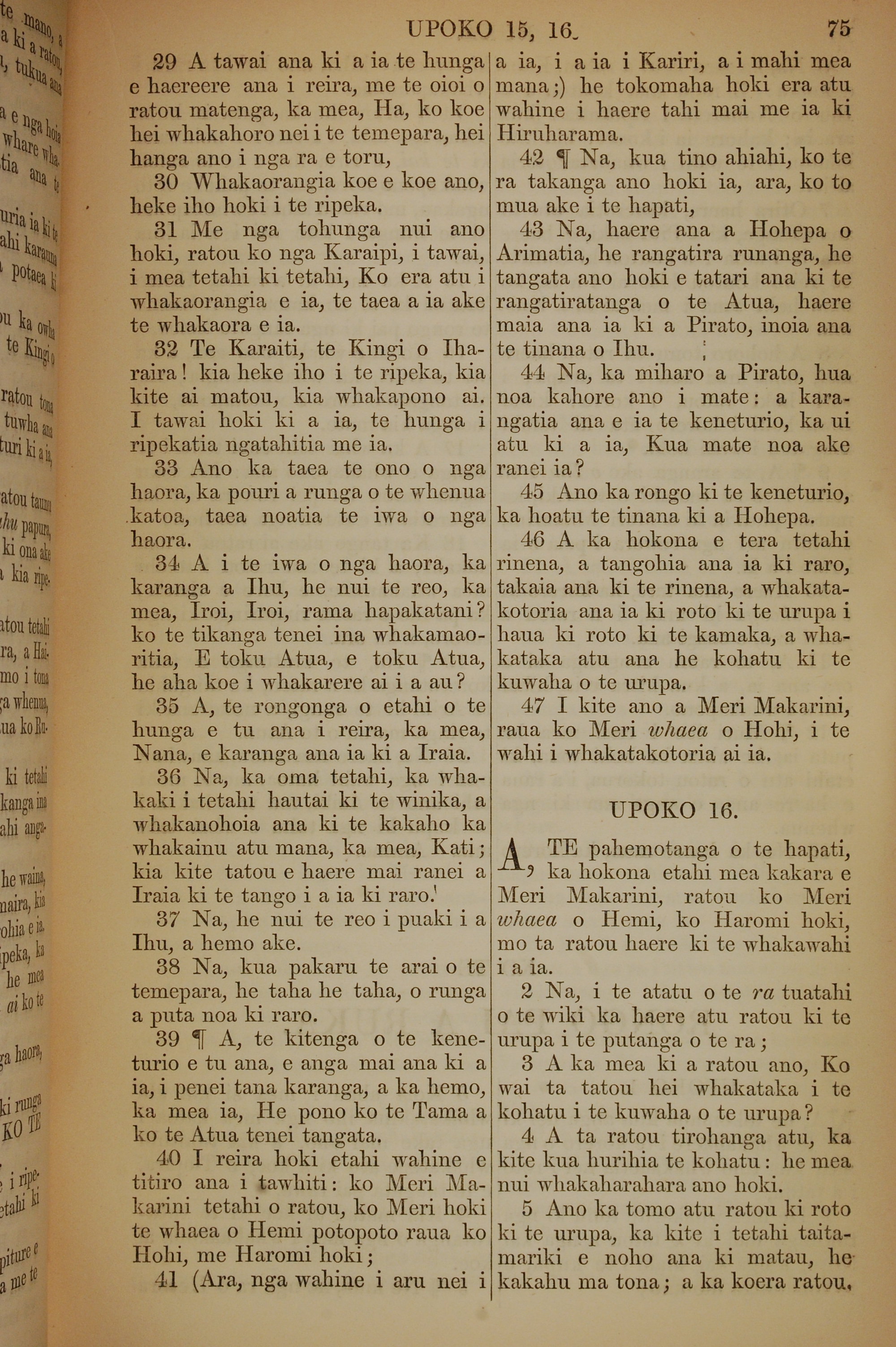 1852年KO TE KAWENATA HOU O TO TATOU ARIKI O TE KAI WHAKAORA O IHU KARAITI 馬可福音 15 章 29 節到 16 章 5 節