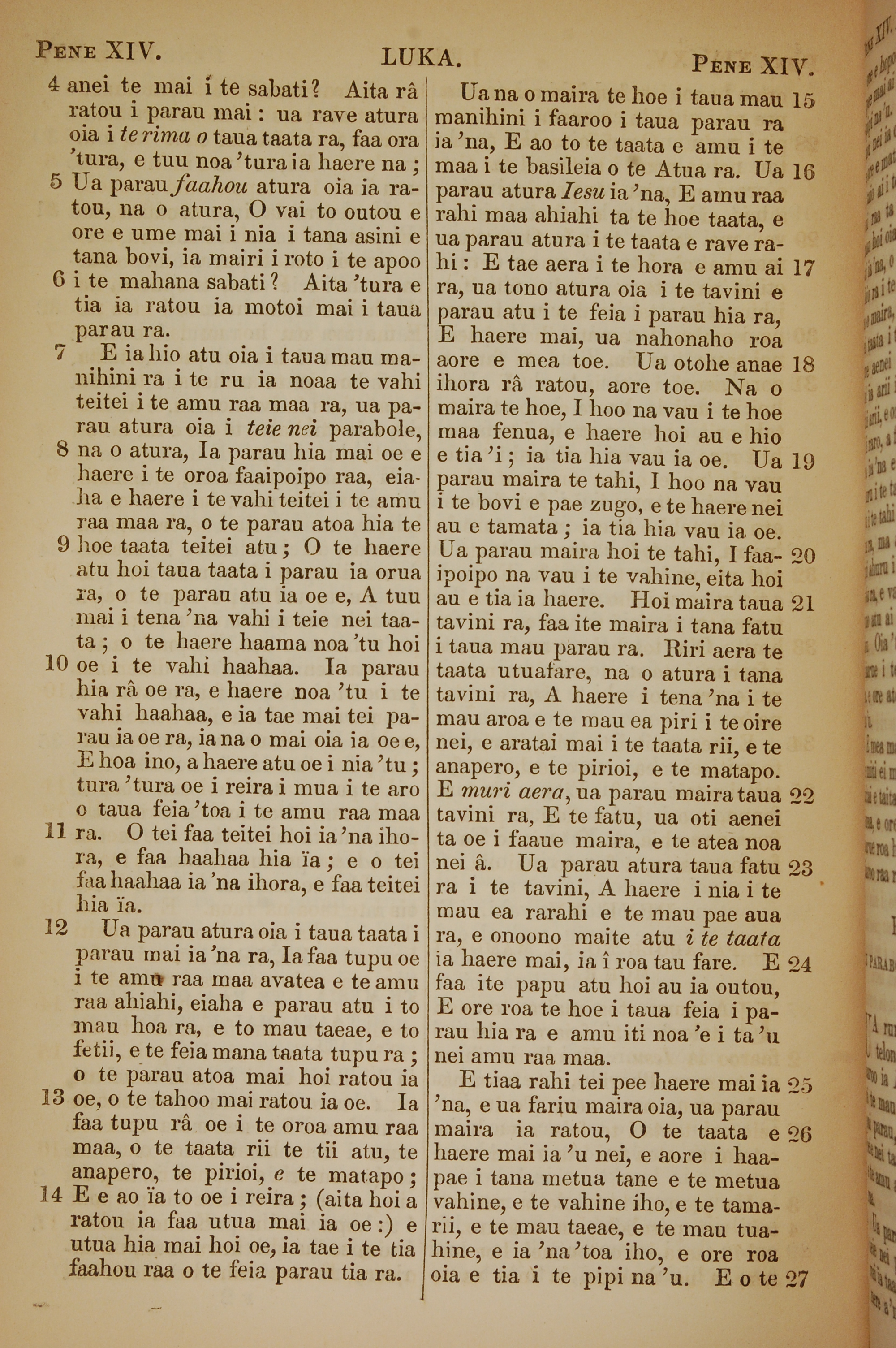 1853年塔希提語新約全書 路加福音 14 章 4 節到 14 章 27 節