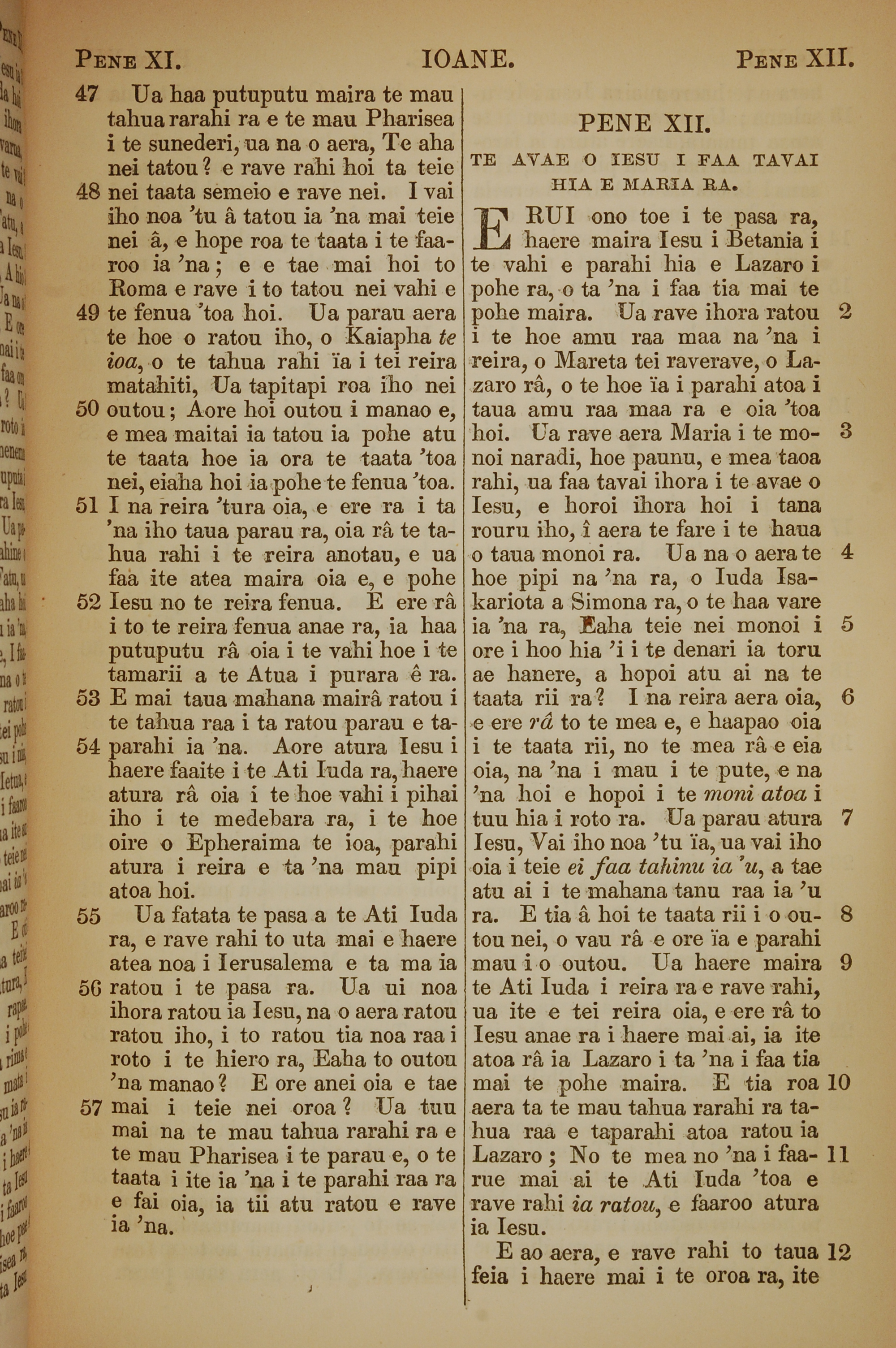 1853年塔希提語新約全書 約翰福音 11 章 47 節到 12 章 12 節