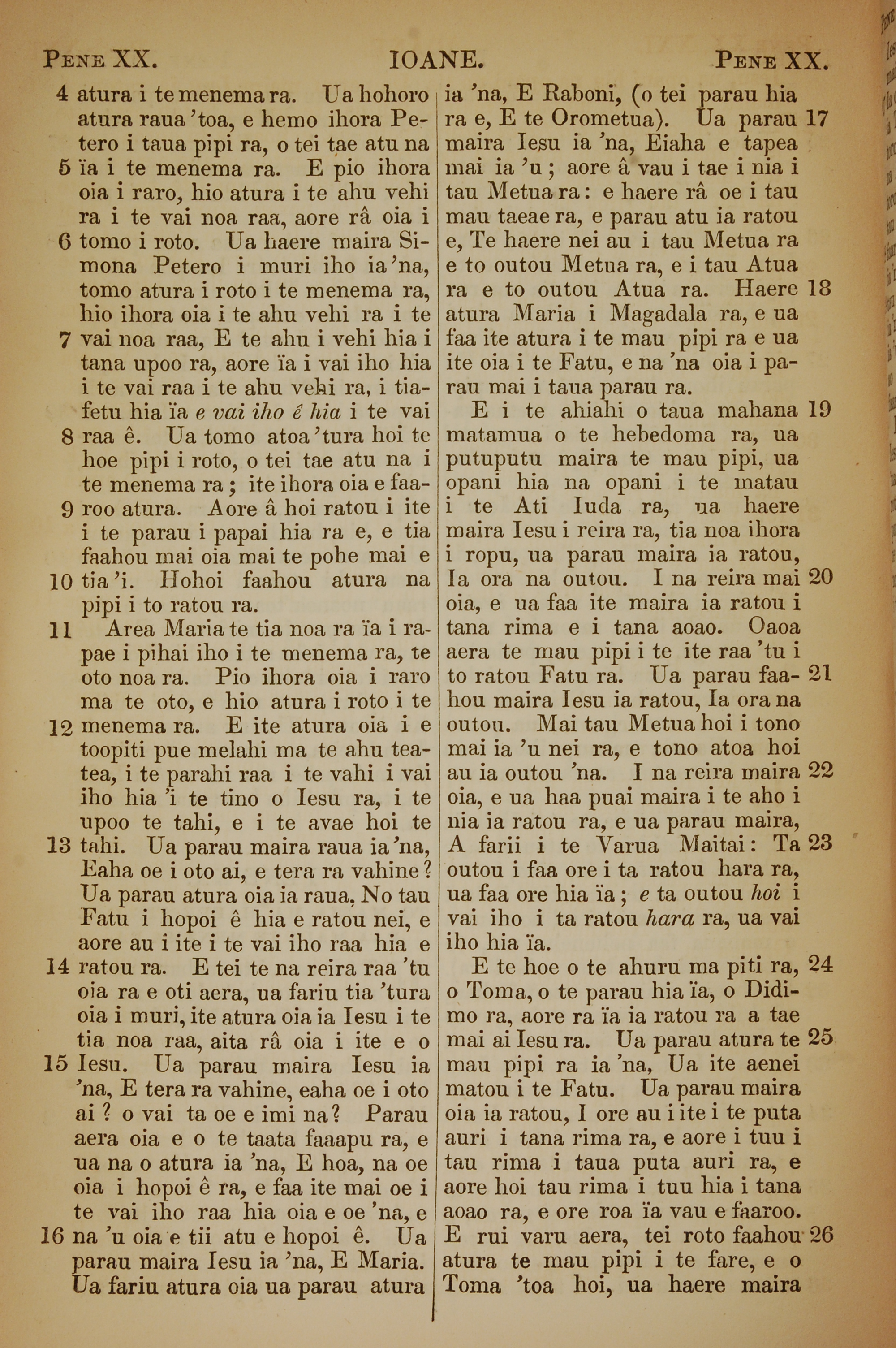 1853年塔希提語新約全書 約翰福音 20 章 4 節到 20 章 26 節