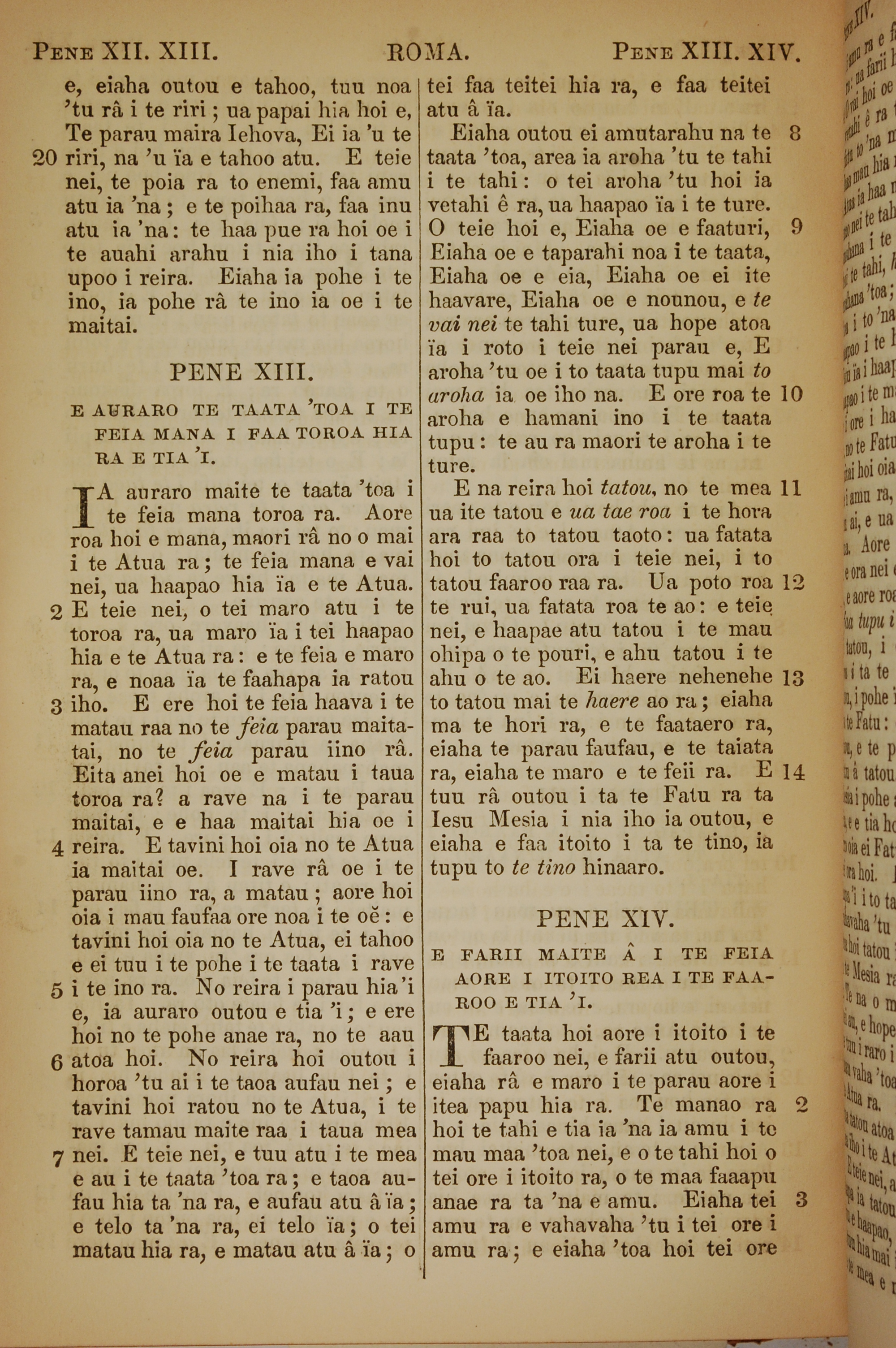 1853年塔希提語新約全書 羅馬書 12 章 20 節到 14 章 3 節