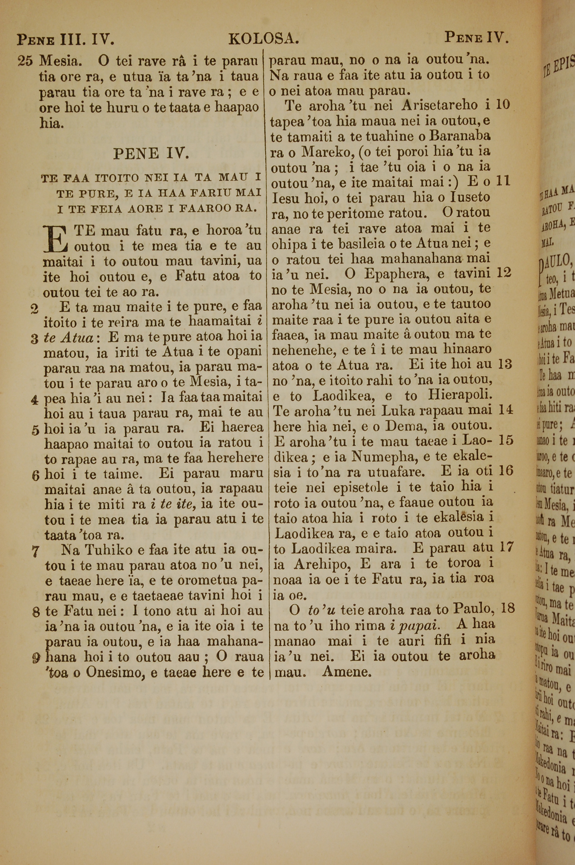1853年塔希提語新約全書 歌羅西書 3 章 25 節到 4 章 18 節