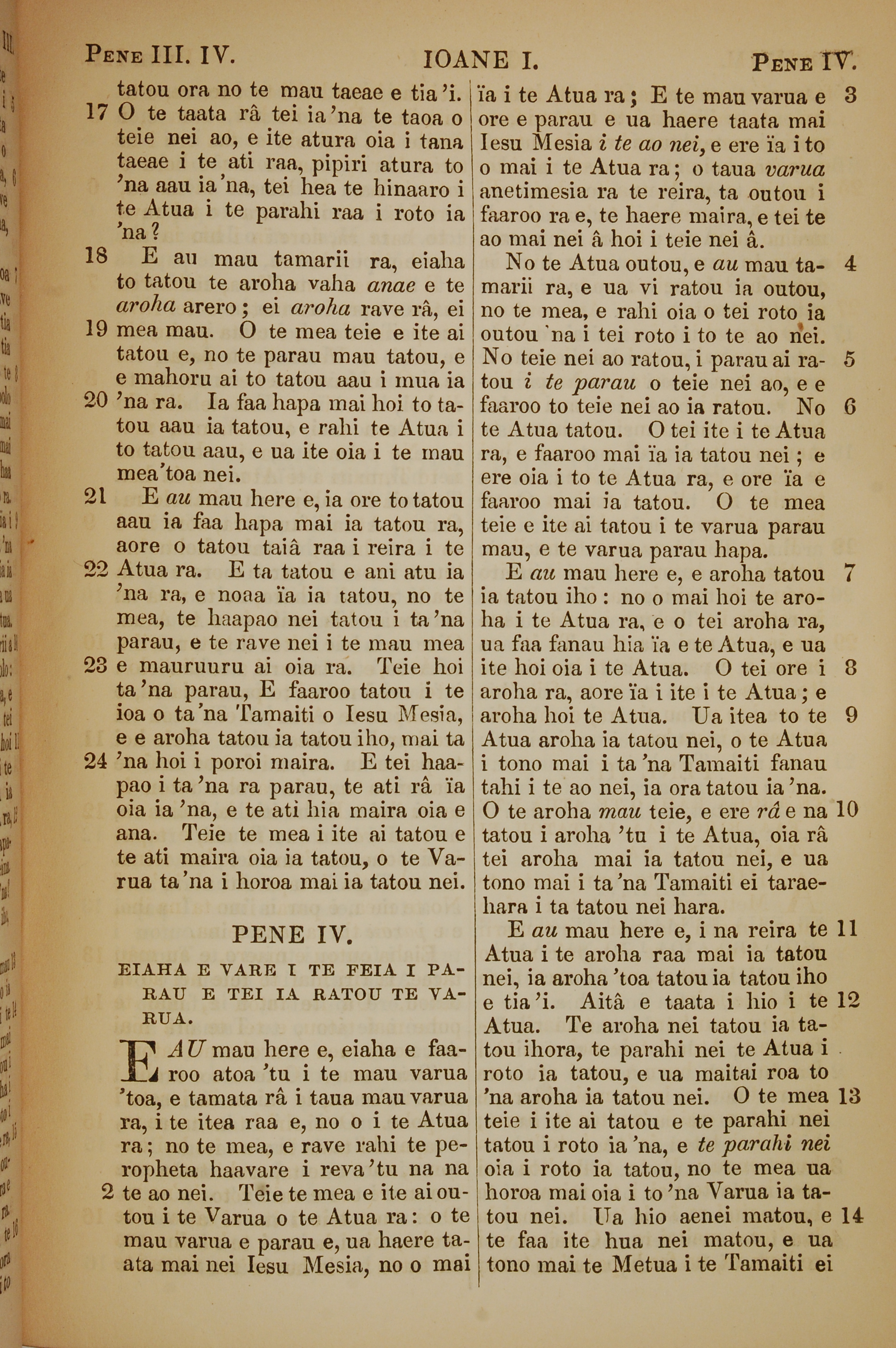 1853年塔希提語新約全書 約翰一書 3 章 17 節到 4 章 14 節