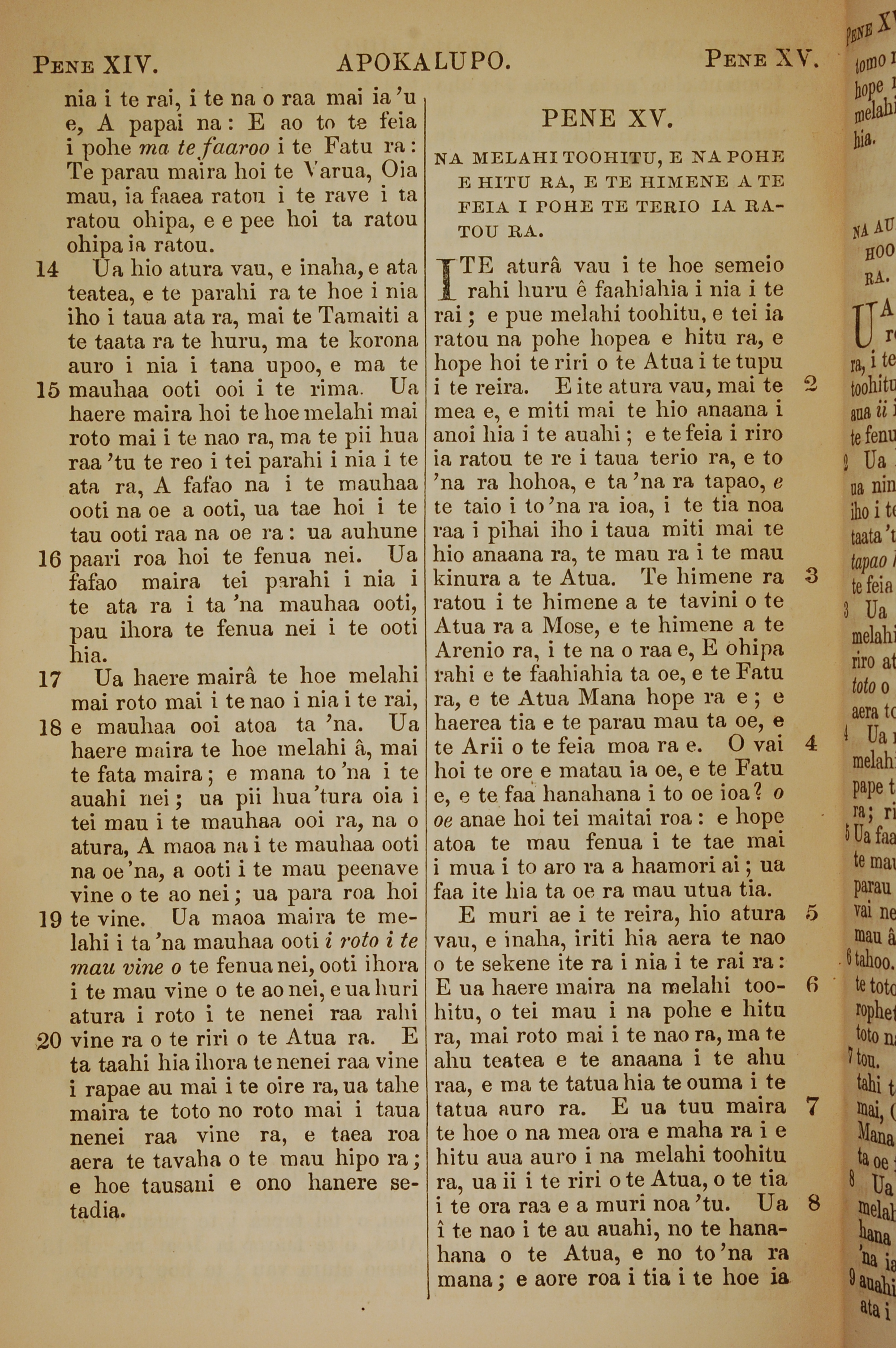 1853年塔希提語新約全書 啟示錄 14 章 14 節到 15 章 8 節