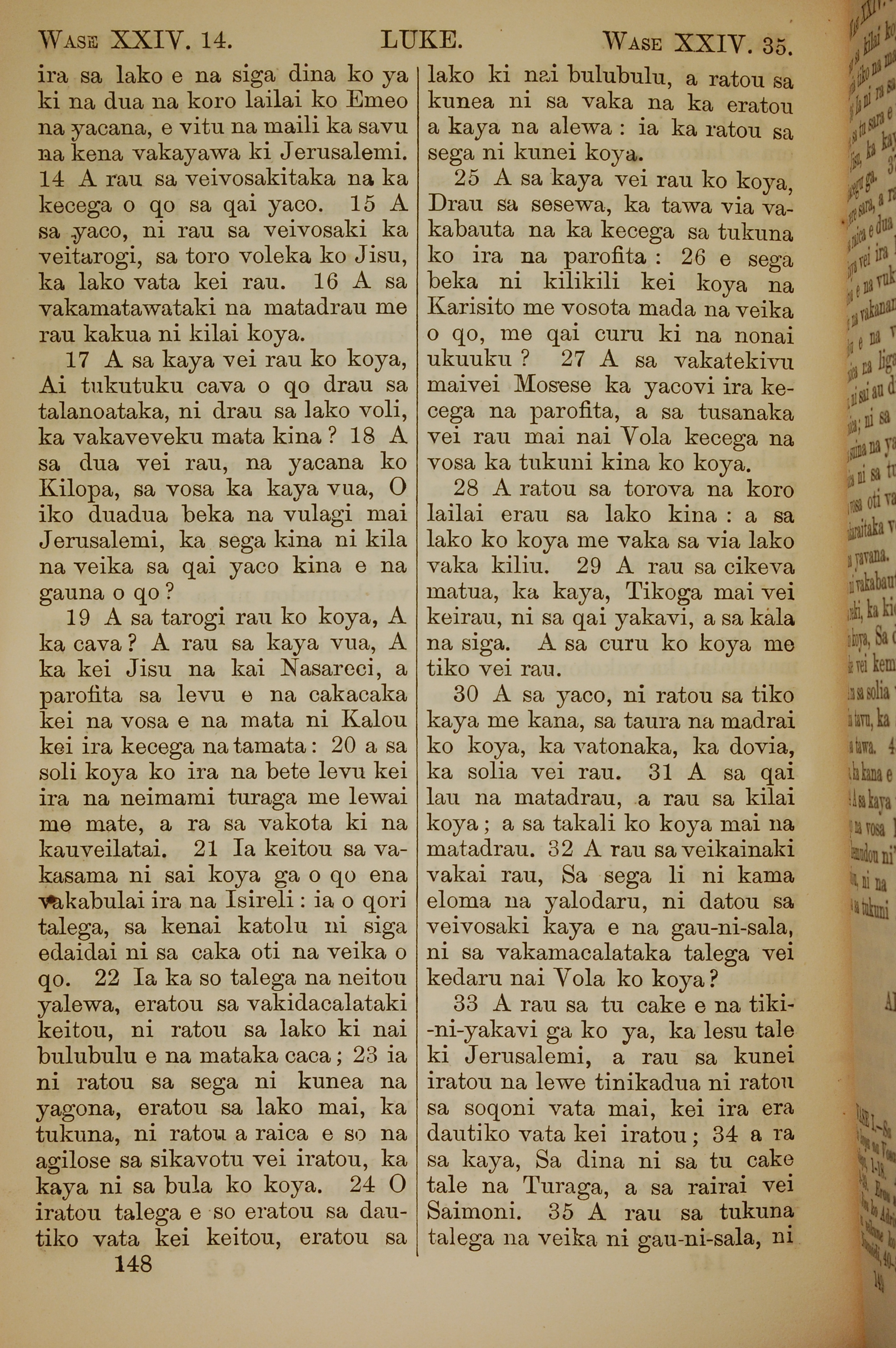 1858年斐濟文新約全書 路加福音 24 章 14 節到 24 章 35 節