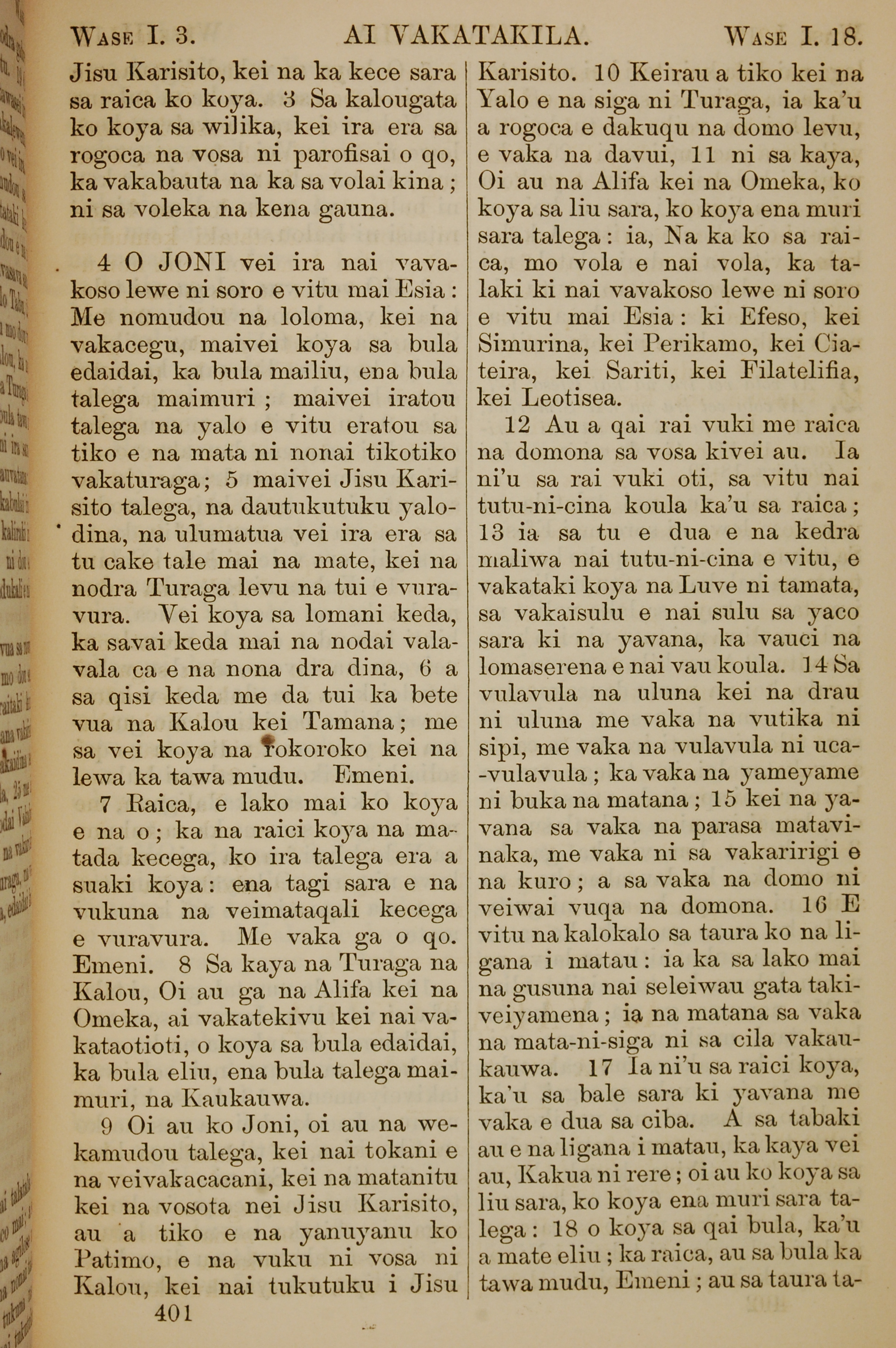 1858年斐濟文新約全書 啟示錄 1 章 3 節到 1 章 18 節