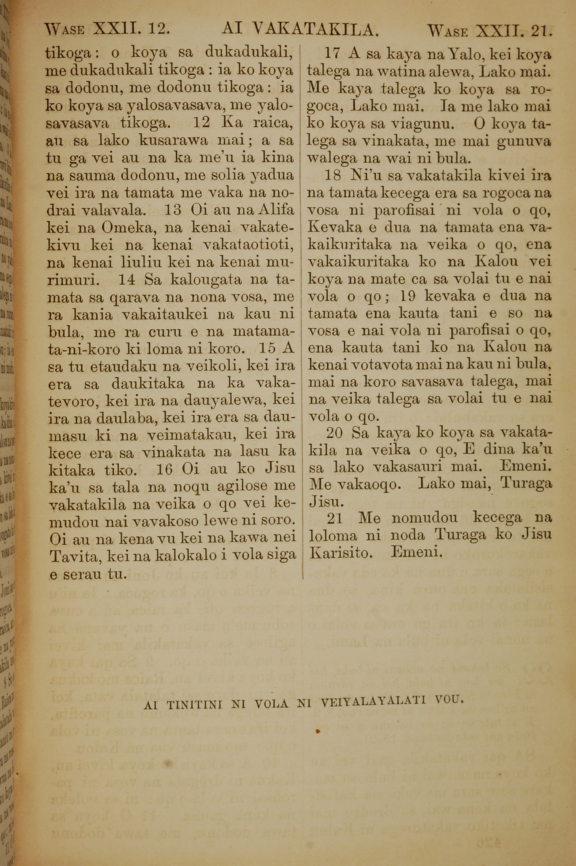 1858年斐濟文新約全書 啟示錄 22 章 12 節到 22 章 21 節