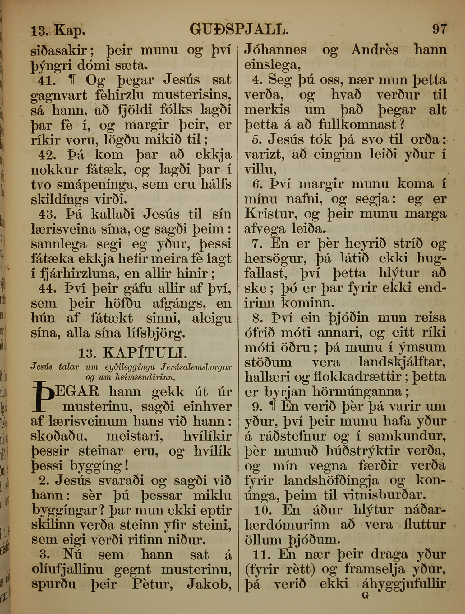 1863年冰島語新約全書 馬可福音 12 章 41 節到 13 章 11 節