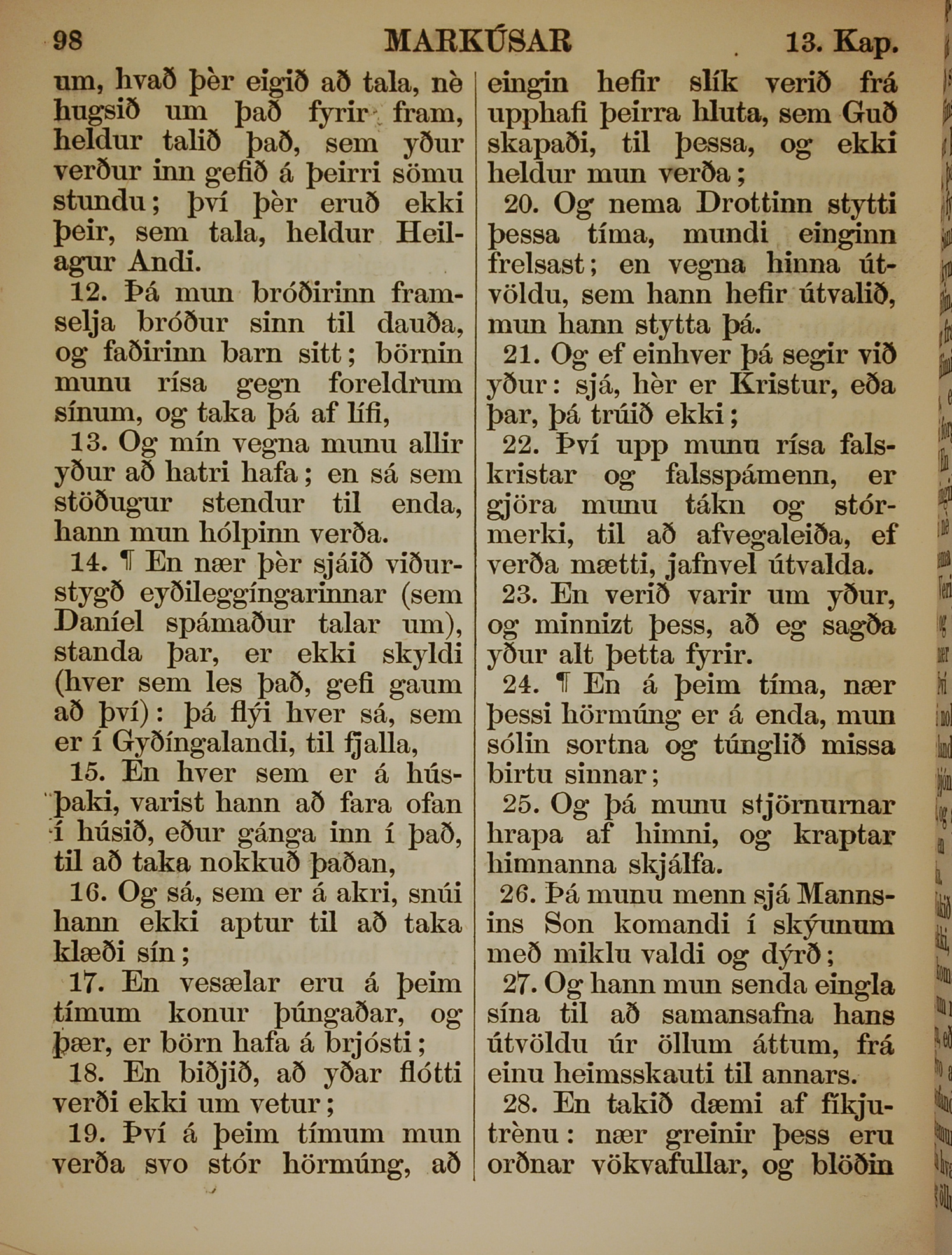 1863年冰島語新約全書 馬可福音 13 章 12 節到 13 章 28 節