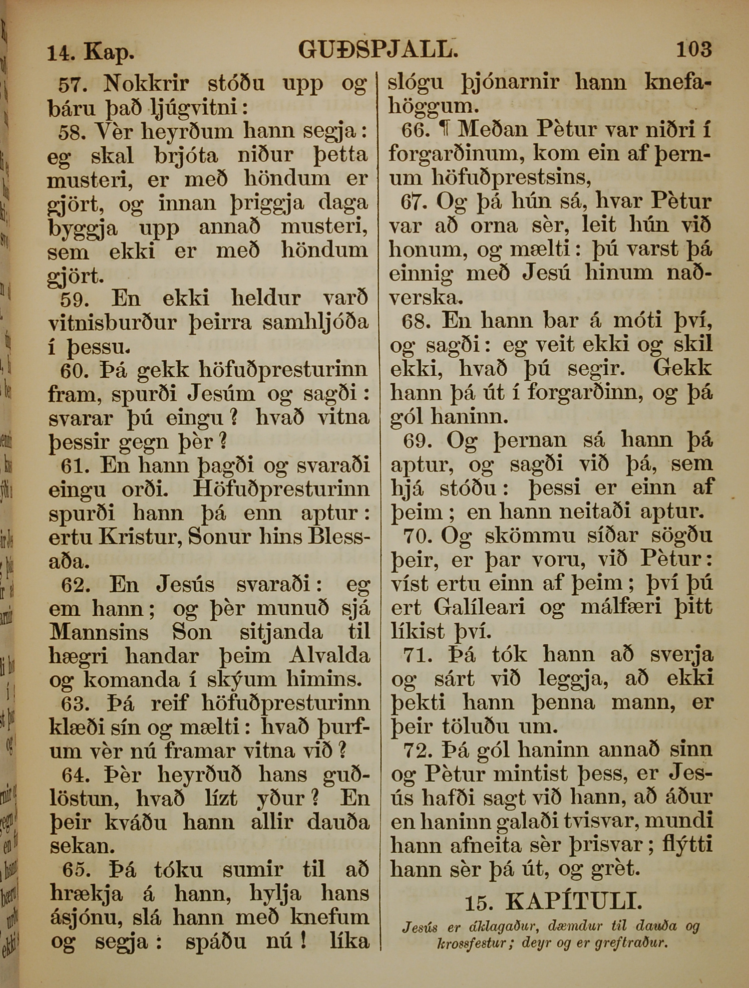 1863年冰島語新約全書 馬可福音 14 章 57 節到 14 章 72 節