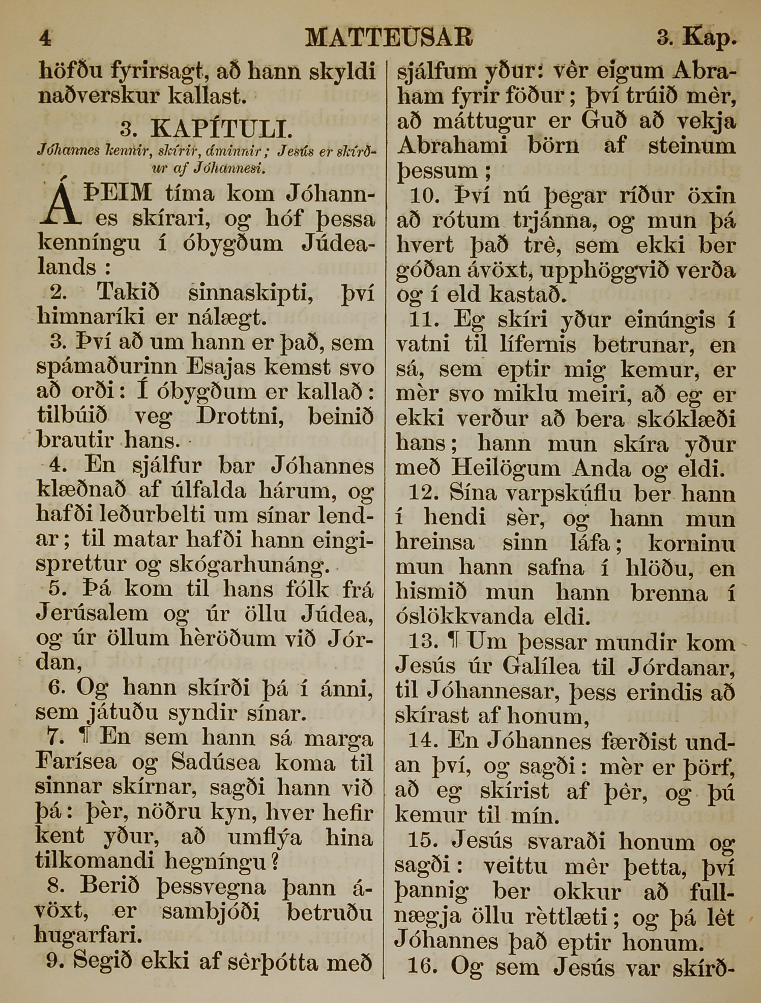 1863年冰島語新約全書 馬太福音 3 章 1 節到 3 章 16 節