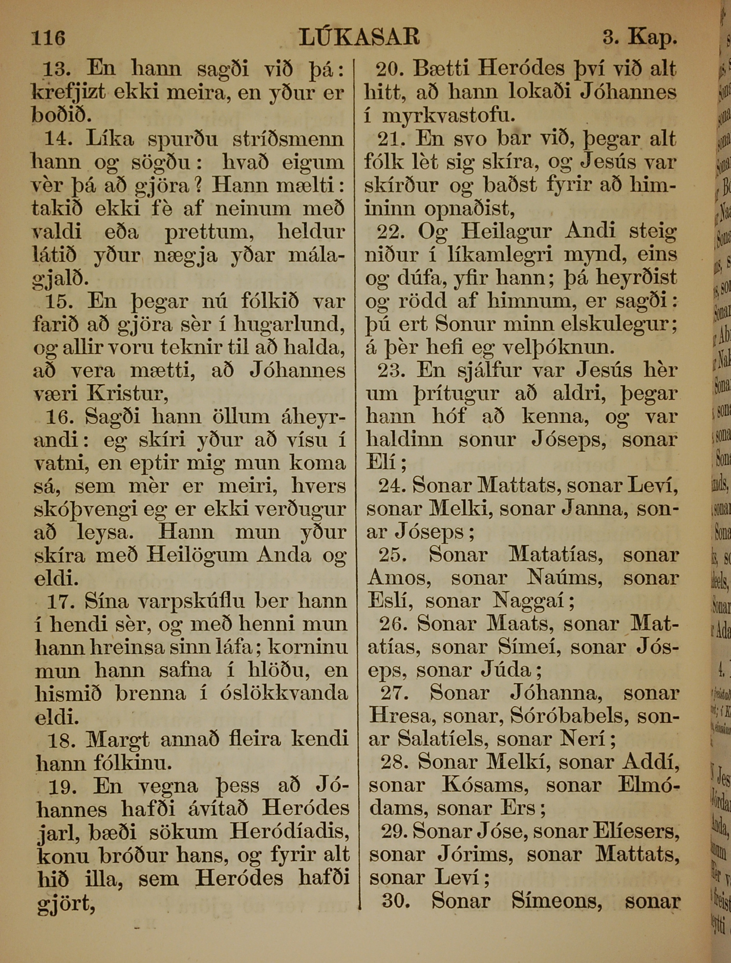 1863年冰島語新約全書 路加福音 3 章 13 節到 3 章 30 節
