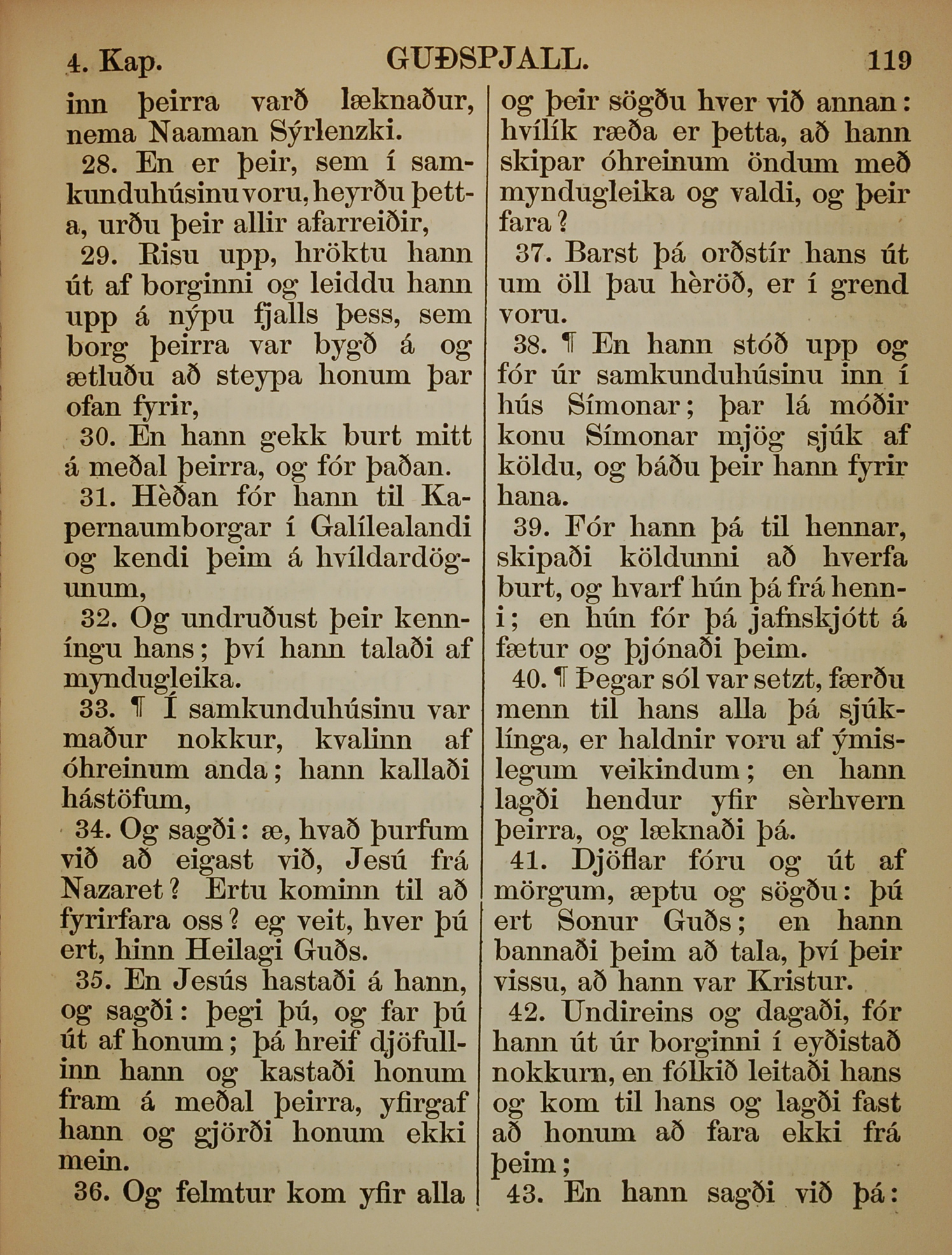 1863年冰島語新約全書 路加福音 4 章 28 節到 4 章 43 節