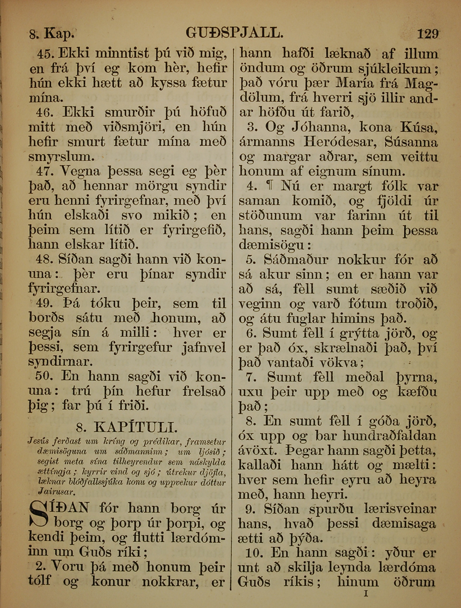 1863年冰島語新約全書 路加福音 7 章 45 節到 8 章 10 節