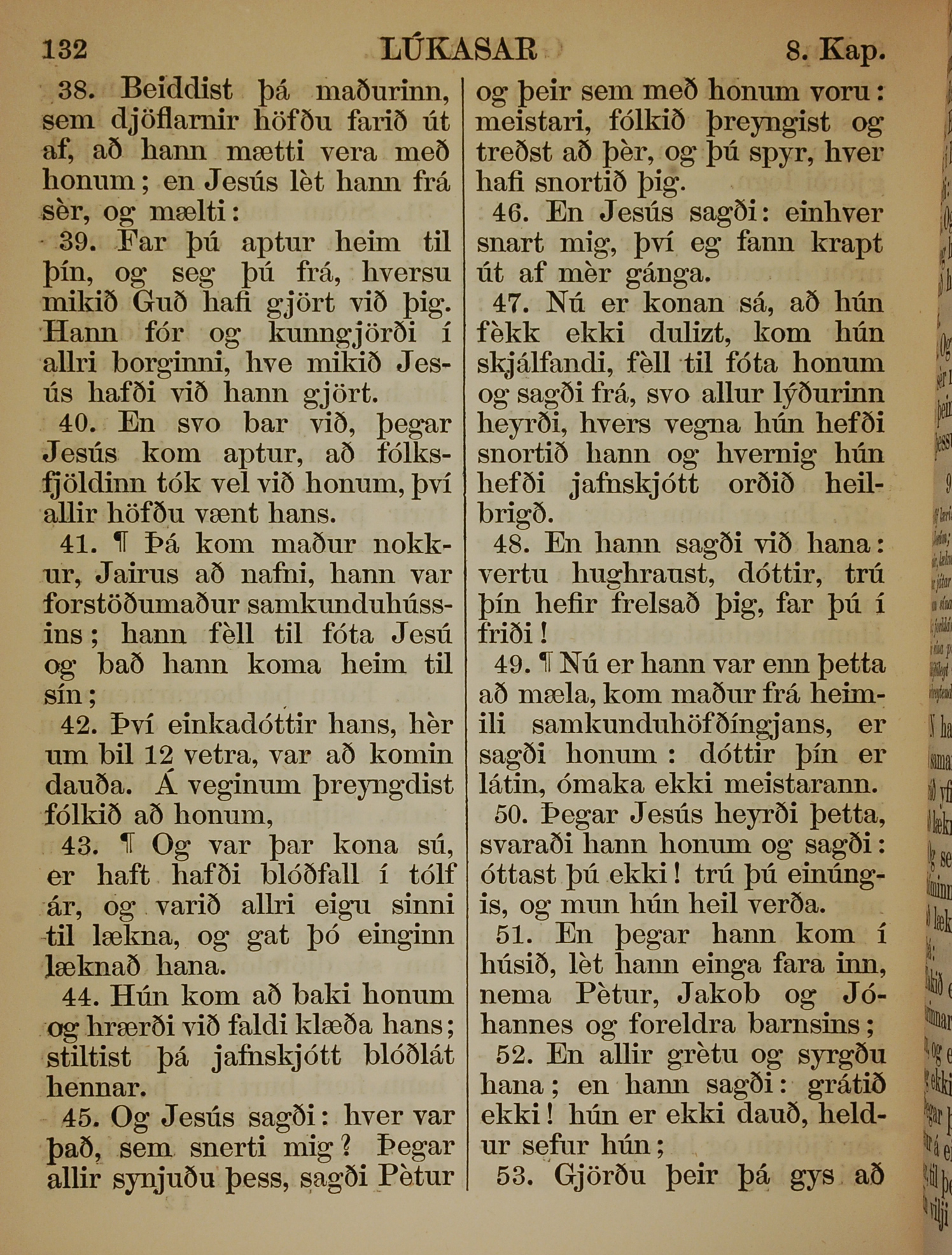 1863年冰島語新約全書 路加福音 8 章 38 節到 8 章 53 節