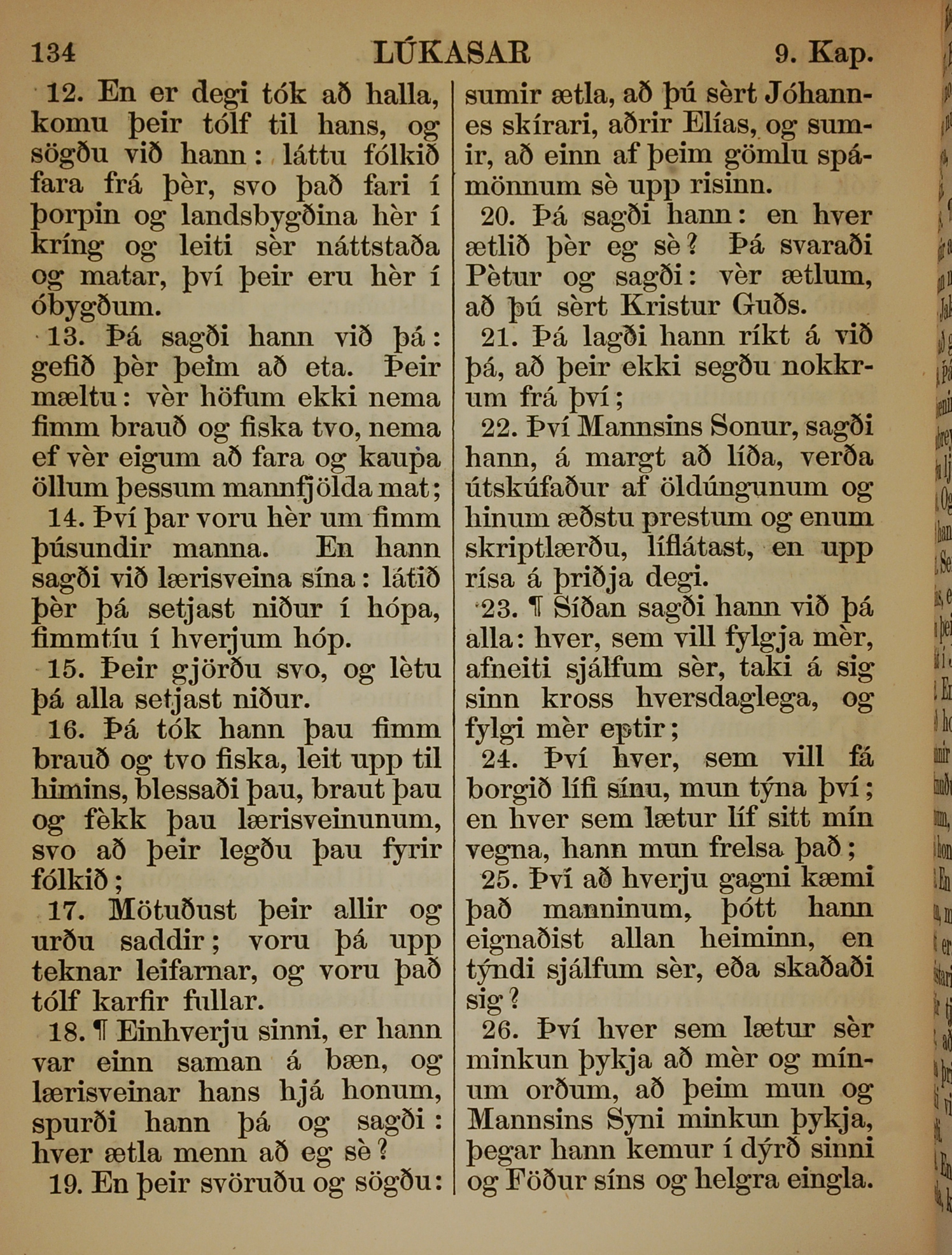 1863年冰島語新約全書 路加福音 9 章 12 節到 9 章 26 節