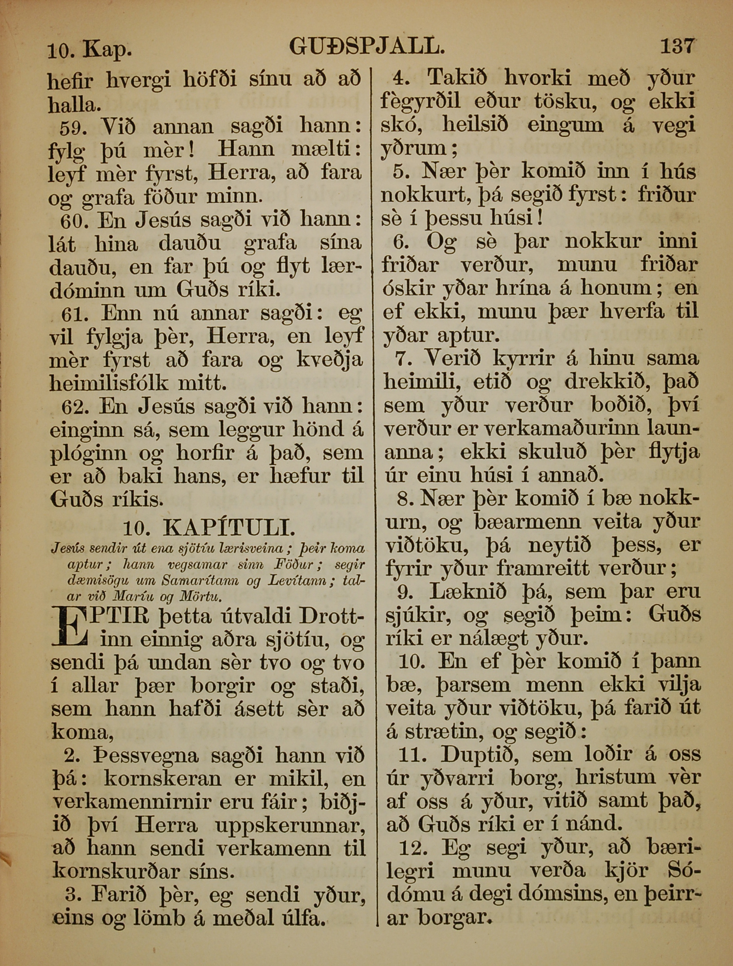 1863年冰島語新約全書 路加福音 9 章 59 節到 10 章 12 節