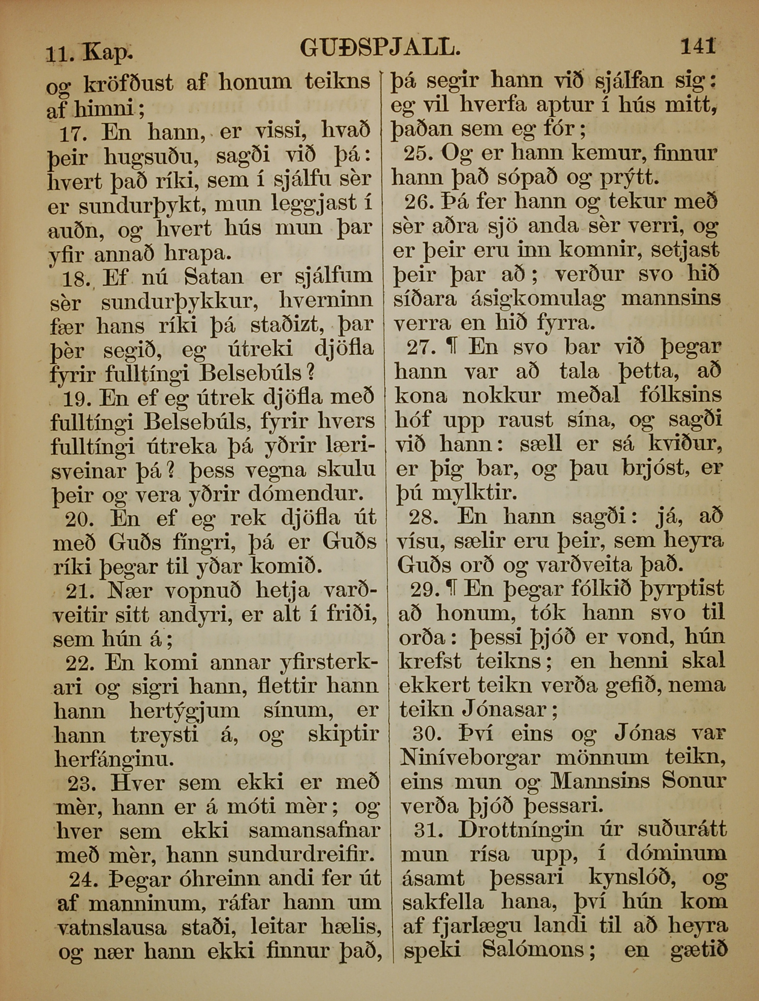 1863年冰島語新約全書 路加福音 11 章 17 節到 11 章 31 節