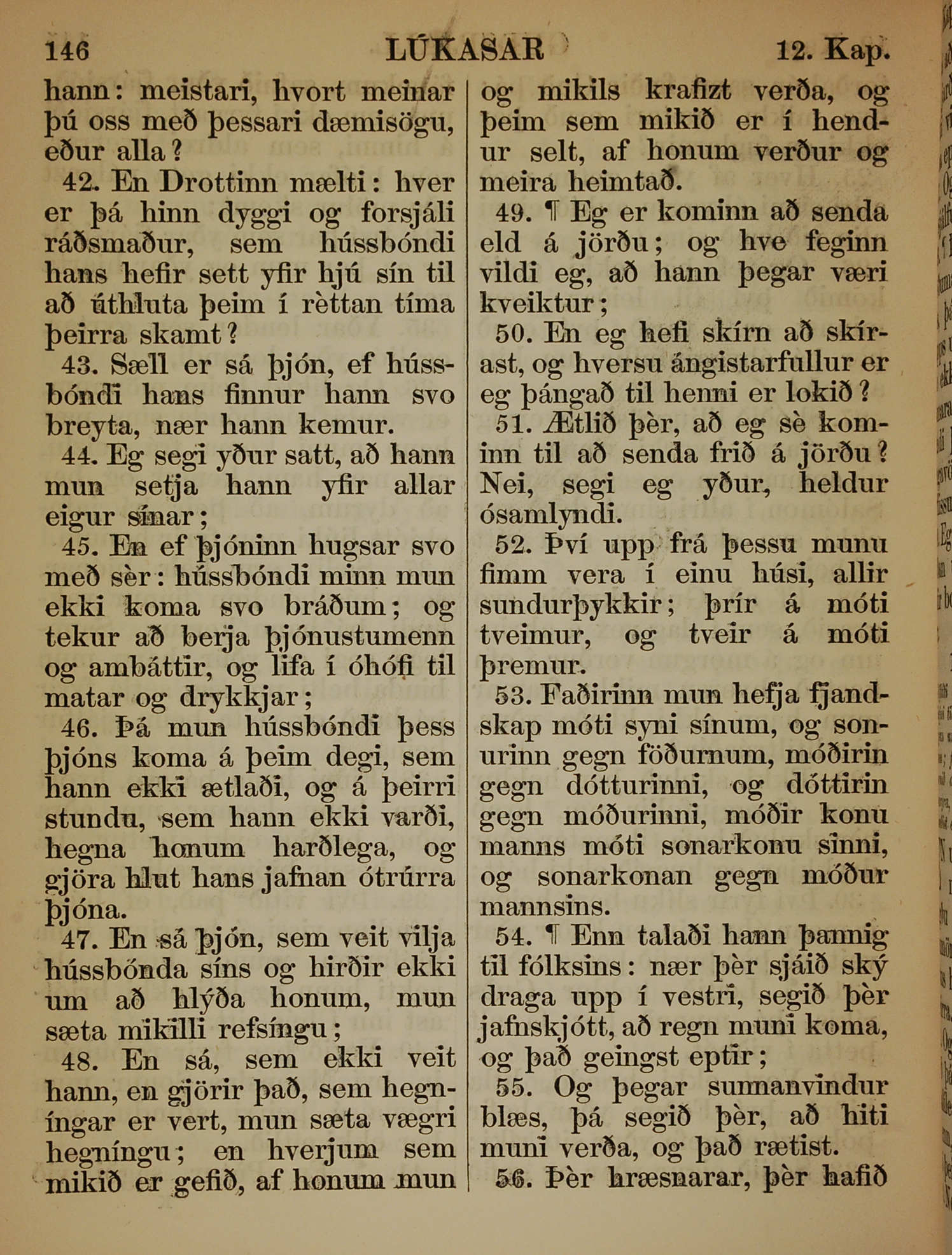 1863年冰島語新約全書 路加福音 12 章 42 節到 12 章 56 節