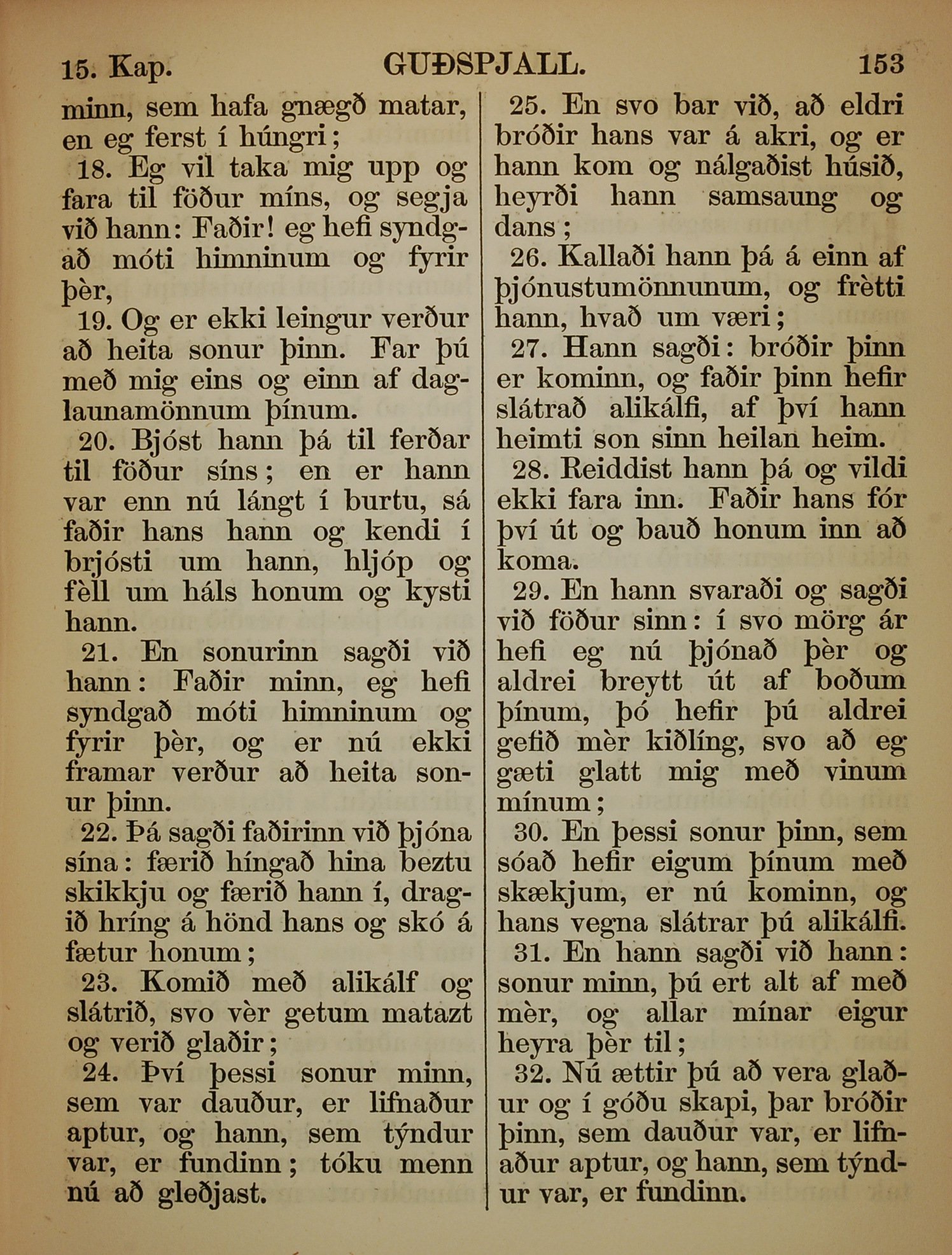 1863年冰島語新約全書 路加福音 15 章 18 節到 15 章 32 節