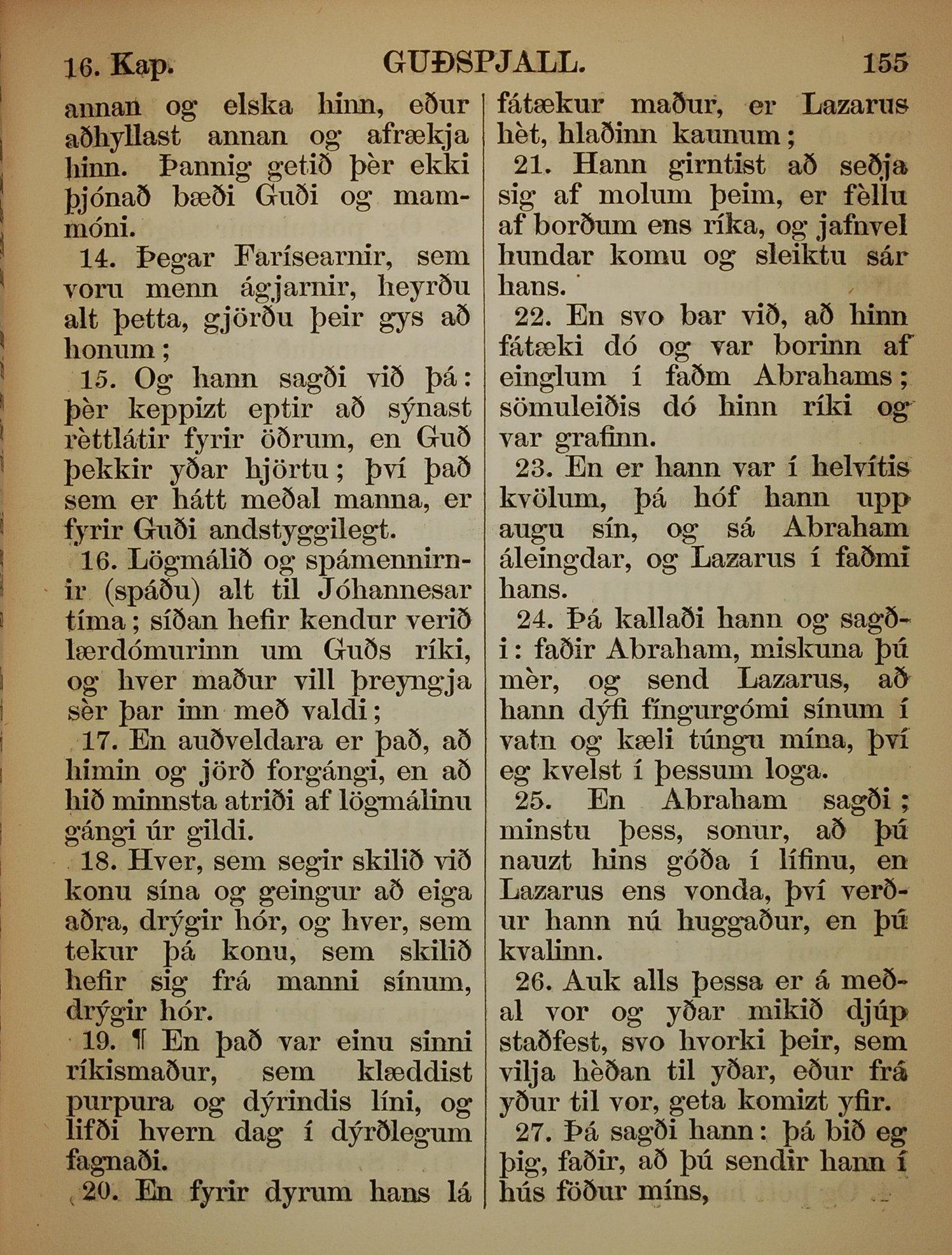 1863年冰島語新約全書 路加福音 16 章 14 節到 16 章 27 節