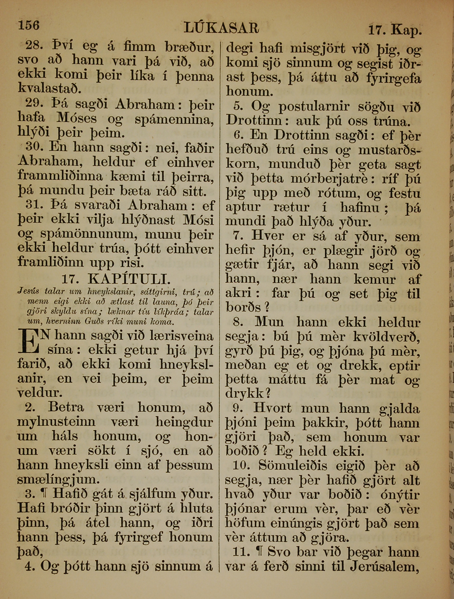 1863年冰島語新約全書 路加福音 16 章 28 節到 17 章 11 節