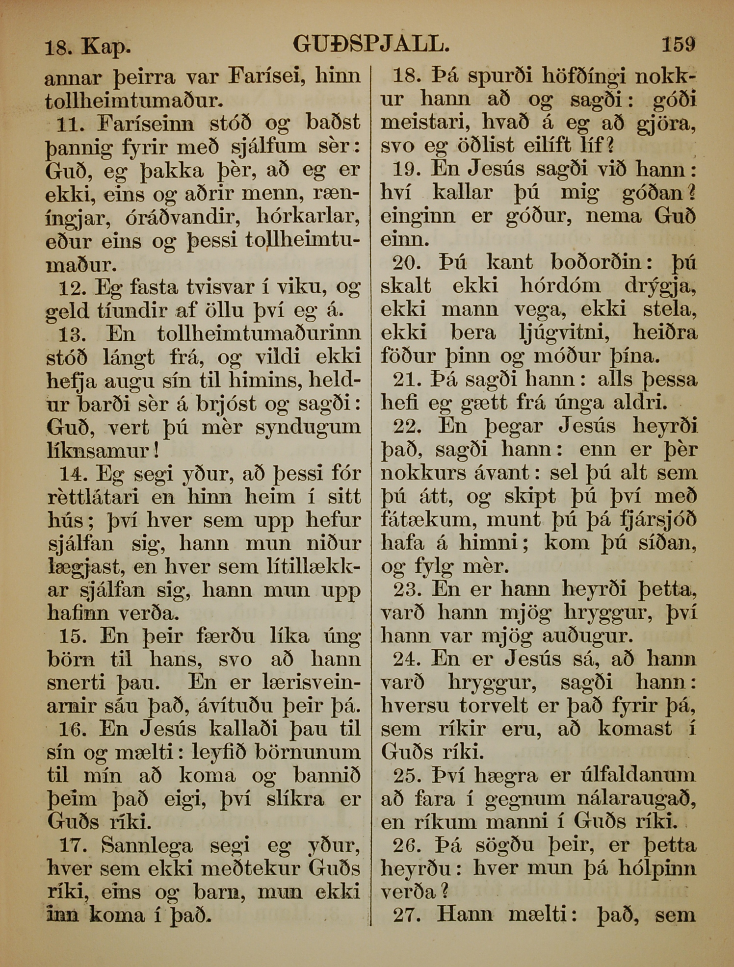 1863年冰島語新約全書 路加福音 18 章 11 節到 18 章 27 節