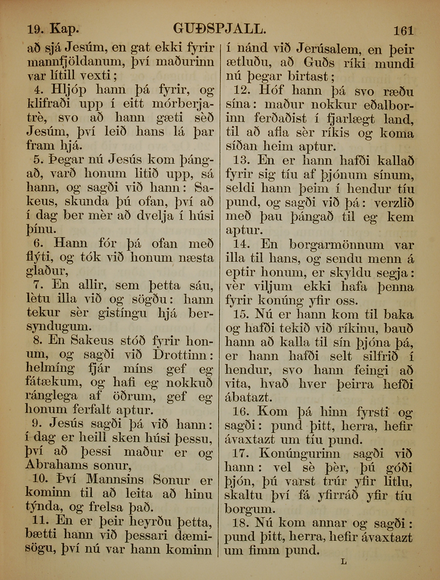 1863年冰島語新約全書 路加福音 19 章 4 節到 19 章 18 節