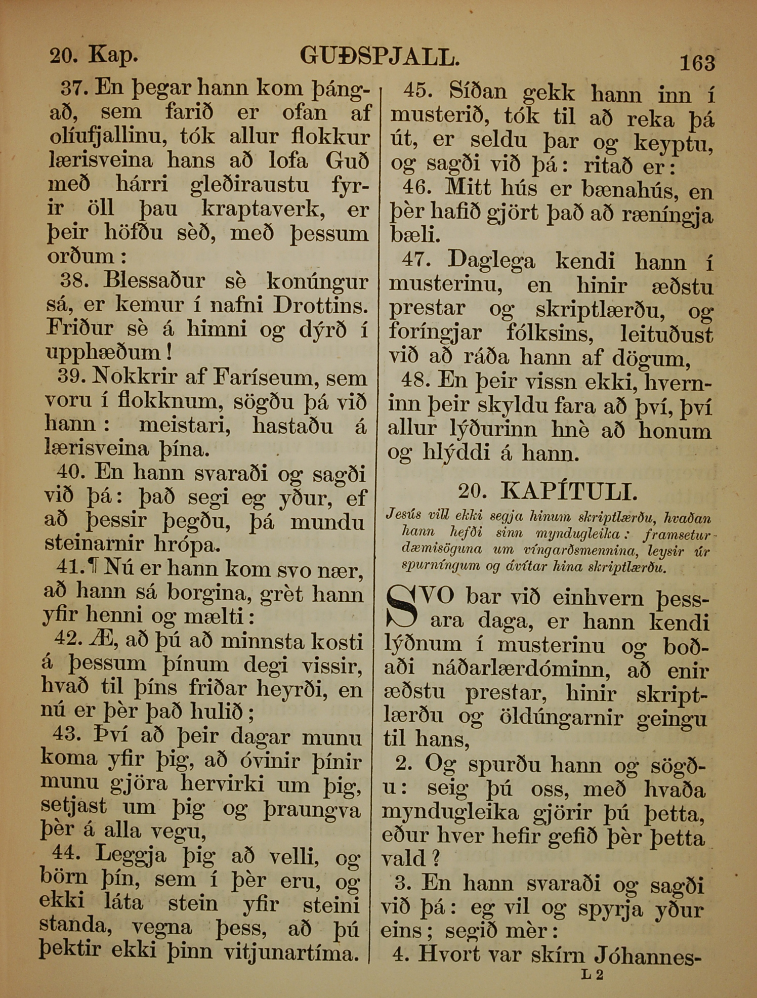 1863年冰島語新約全書 路加福音 19 章 37 節到 20 章 4 節