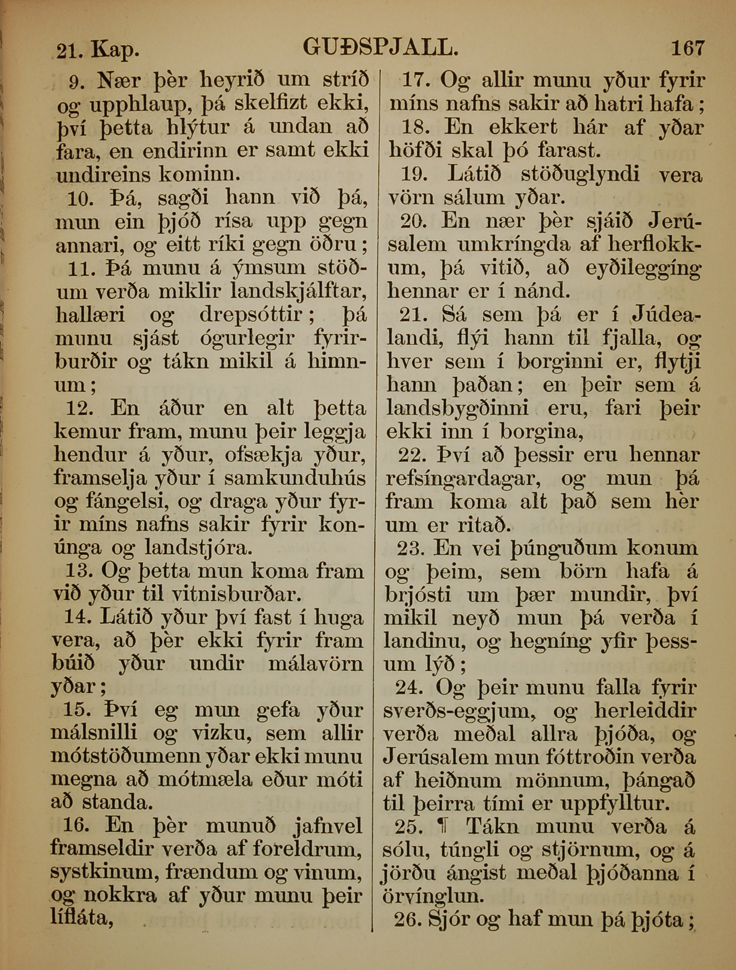 1863年冰島語新約全書 路加福音 21 章 9 節到 21 章 26 節
