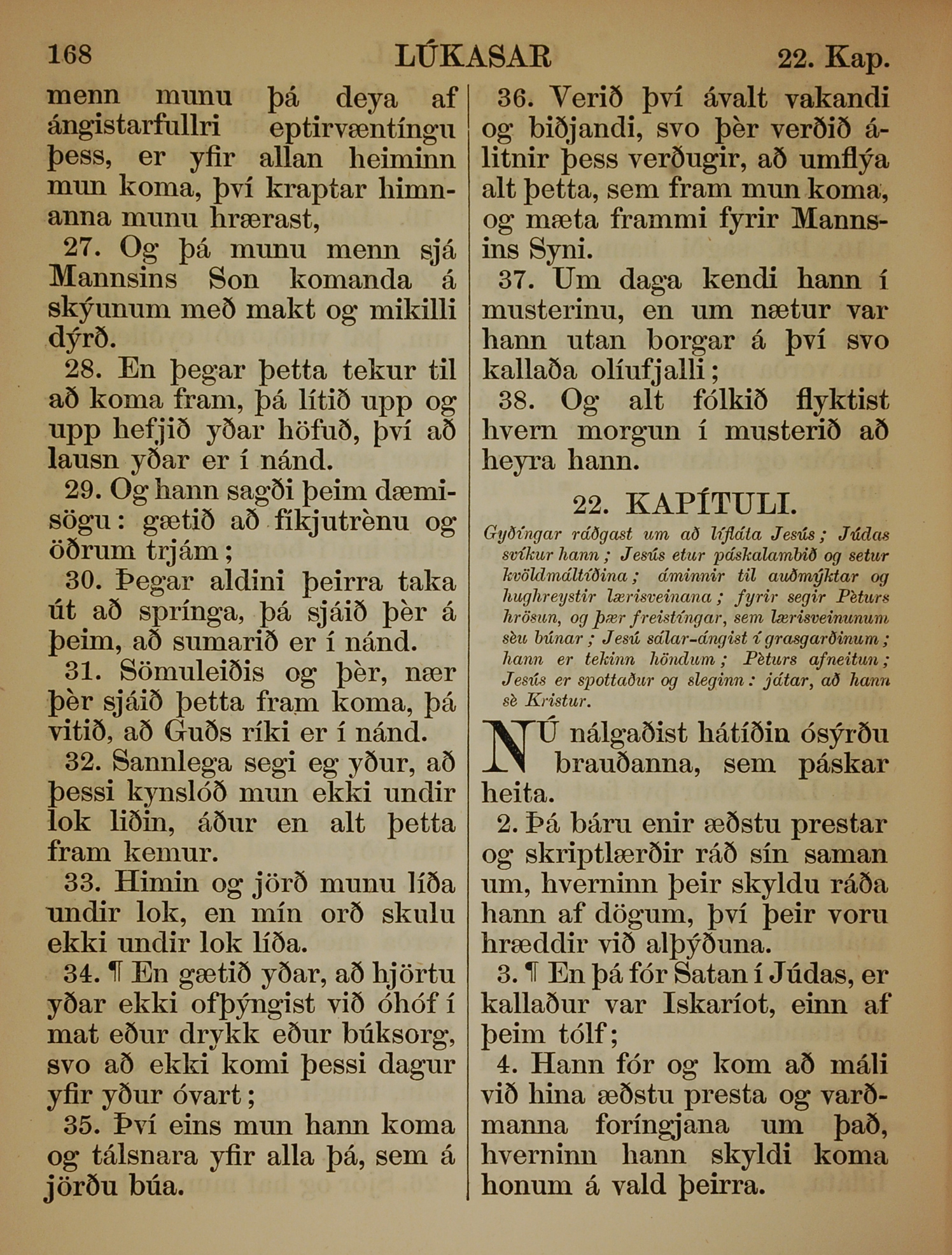 1863年冰島語新約全書 路加福音 21 章 27 節到 22 章 4 節