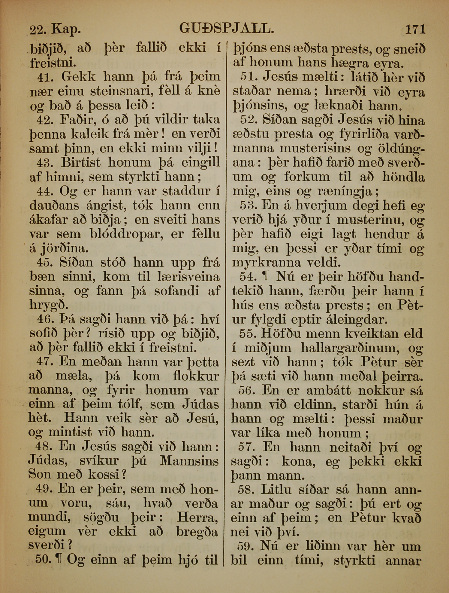 1863年冰島語新約全書 路加福音 22 章 41 節到 22 章 59 節