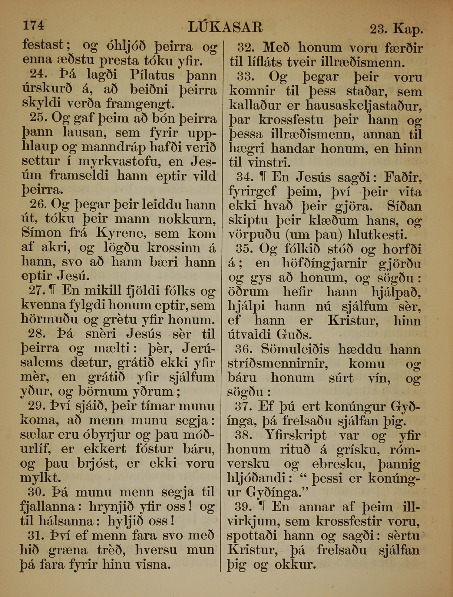 1863年冰島語新約全書 路加福音 23 章 24 節到 23 章 39 節