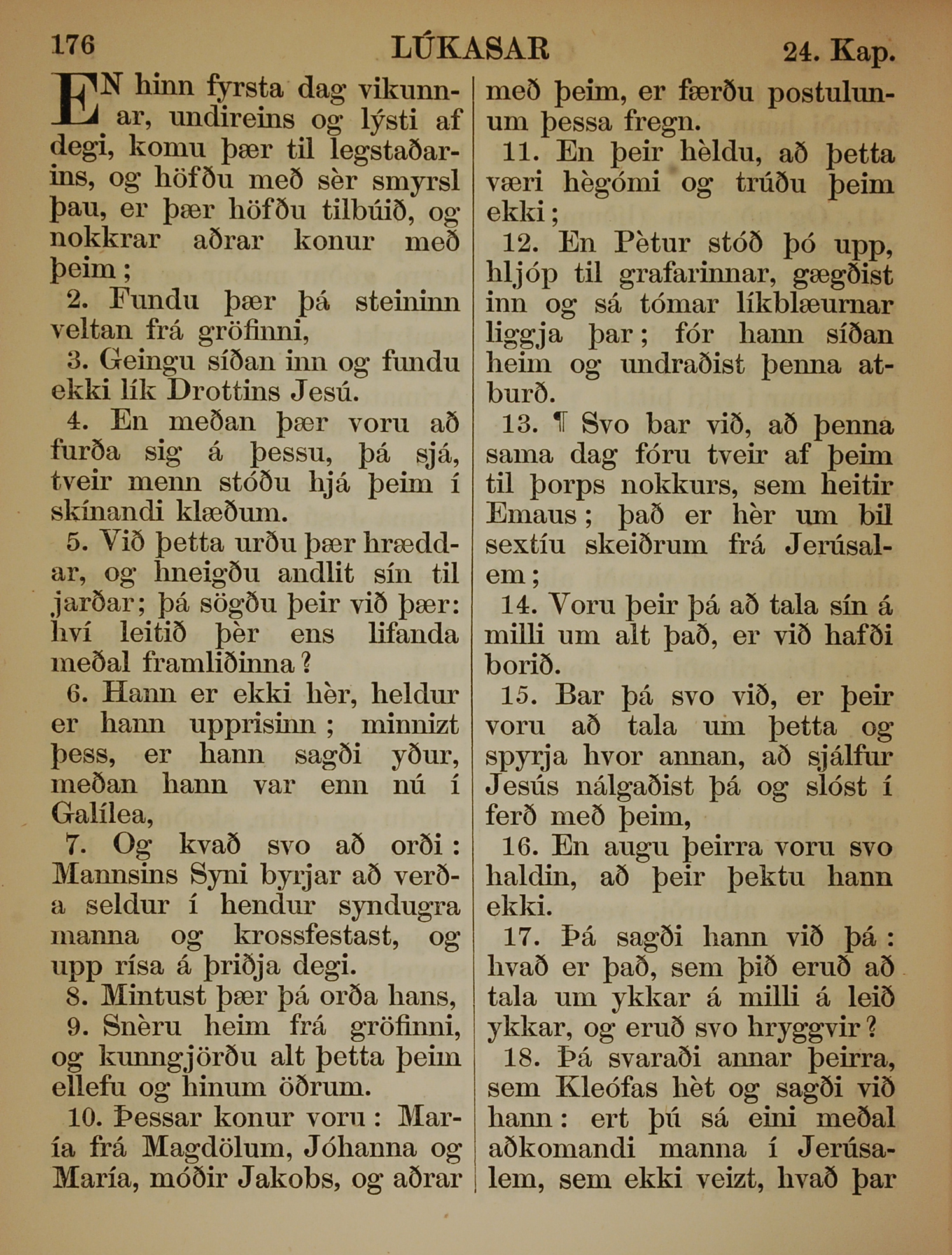 1863年冰島語新約全書 路加福音 24 章 1 節到 24 章 18 節