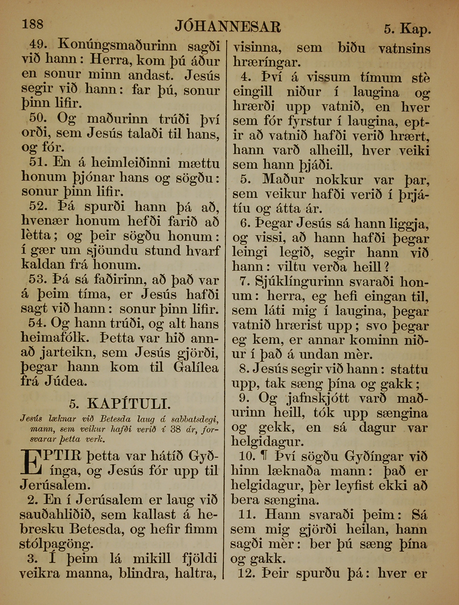 1863年冰島語新約全書 約翰福音 4 章 49 節到 5 章 12 節